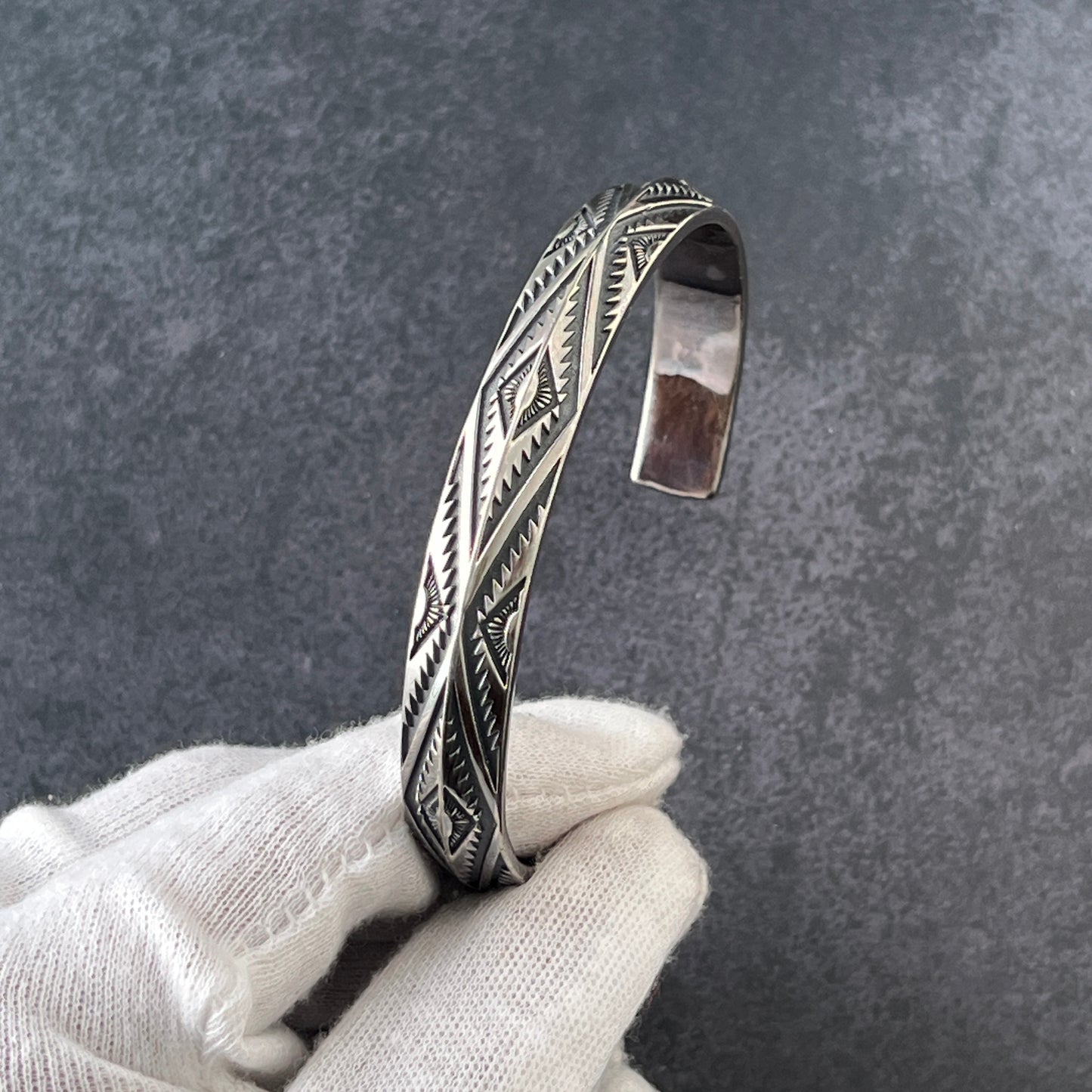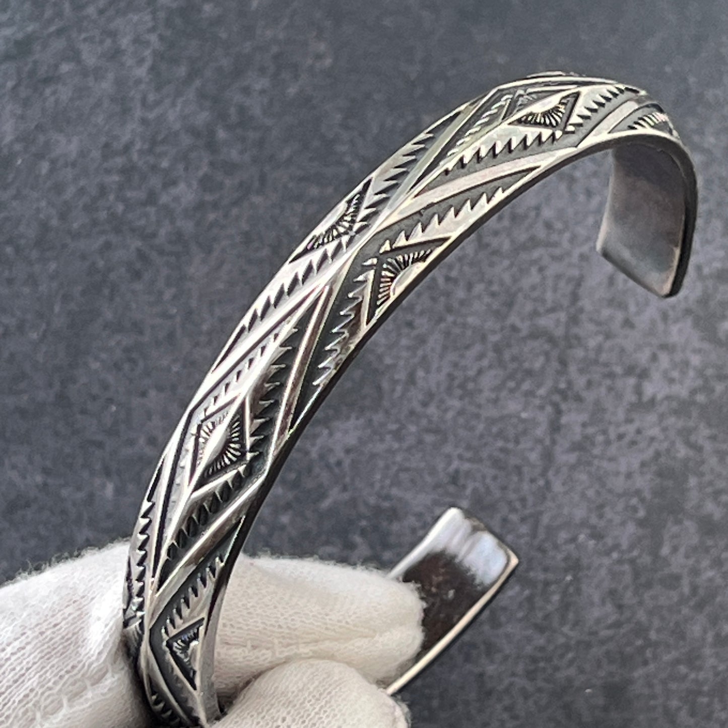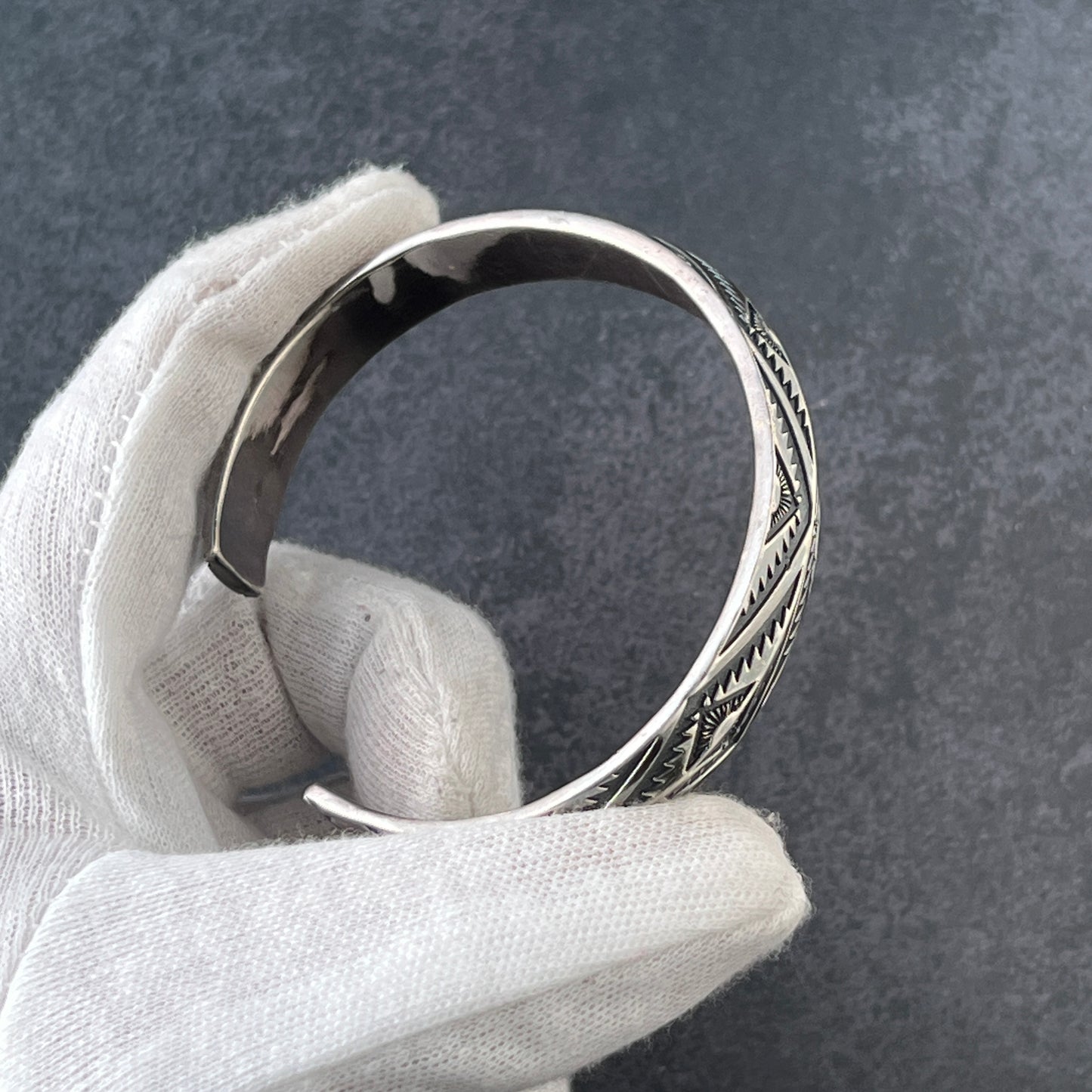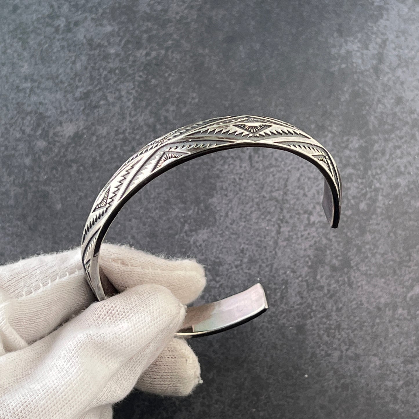 The timeless elegance of our handmade Navajo totem/patterns cuff bracelet, available in two versatile band widths: 10mm and 12mm. Crafted from authentic 925 silver, each bracelet boasts intricate designs that pay homage to Navajo heritage and craftsmanship.