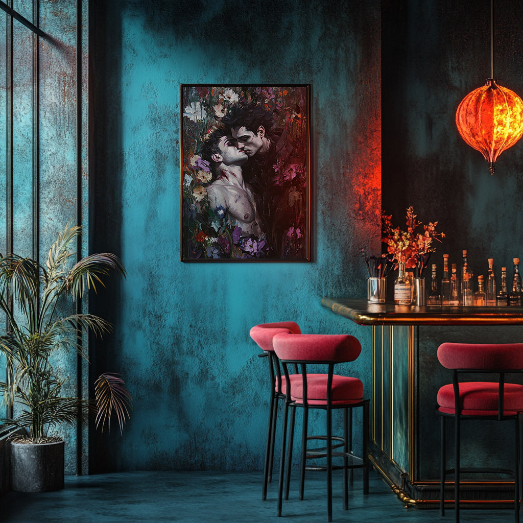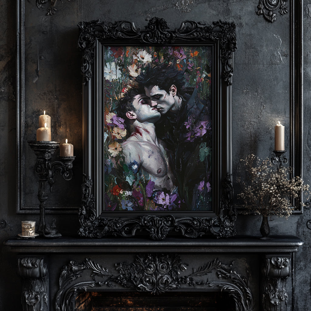 Bring a touch of dark romance and danger to your space with this striking canvas print of vampire lovers caught in a passionate, forbidden kiss. Perfect for fans of gothic gay art, this captivating piece evokes the thrilling tension of dangerous vampire love, adding a moody, mysterious vibe to any room. Ideal for those who appreciate bold, unique decor.