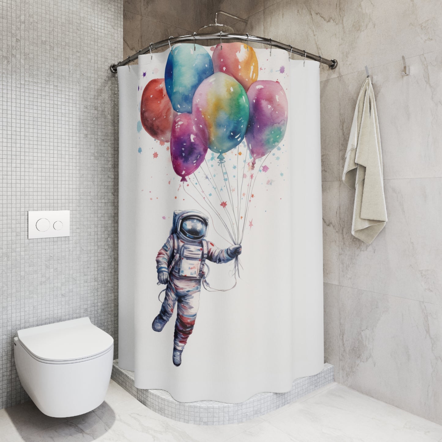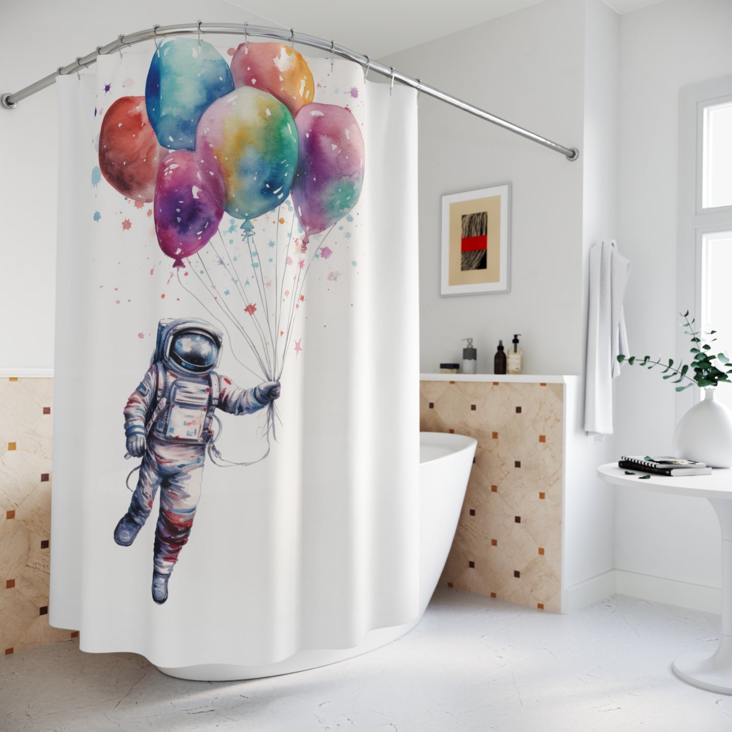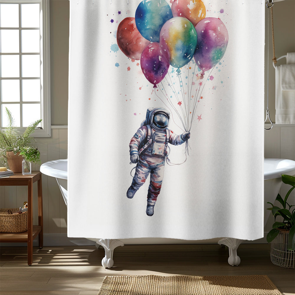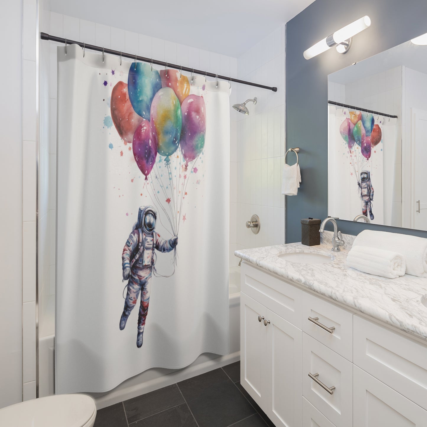 Bathroom decor with our enchanting Astronaut Rising with Balloons Art Print Shower Curtain. This original design features a stunning digital watercolor of an astronaut rising gracefully, held aloft by a cluster of vibrant, colorful balloons against a crisp white background. The combination of space exploration and whimsical watercolor art brings a unique and dreamy touch to your home, perfect for those who love to mix creativity with their everyday spaces.