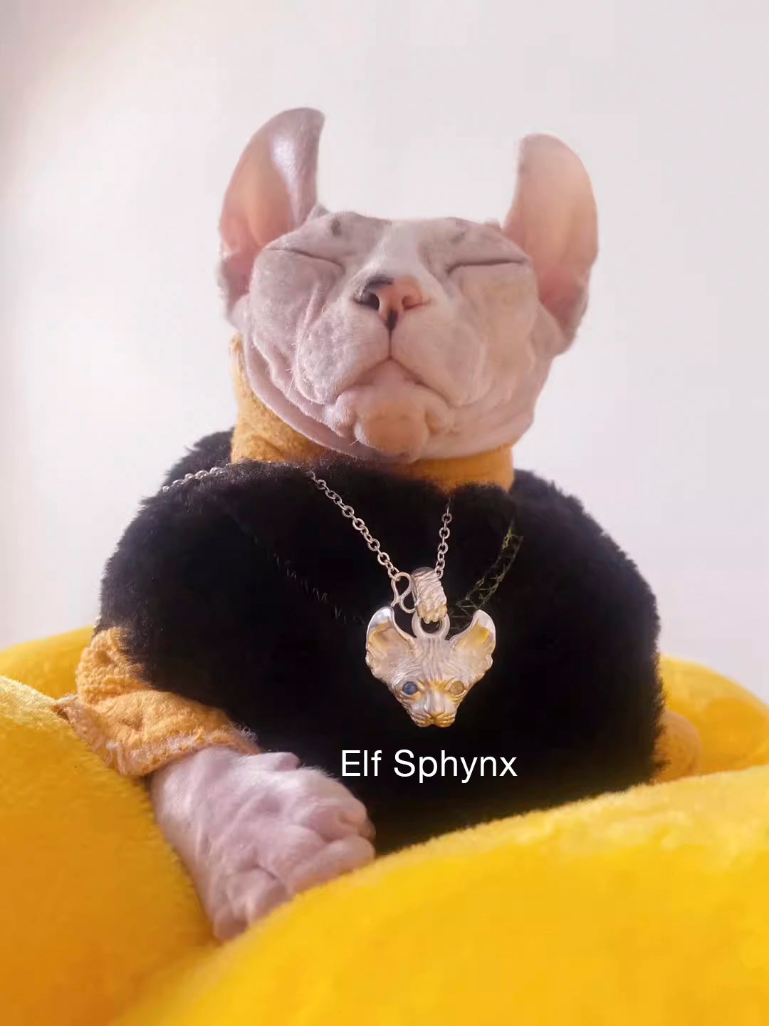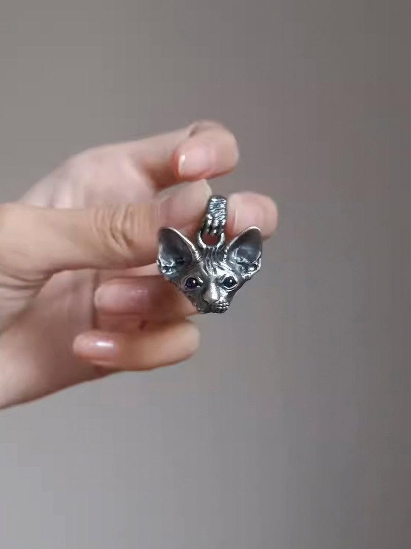 Celebrate your love for Sphynx cats with this handmade solid 925 sterling silver pendant, featuring a beautifully detailed cat head with customizable eye colors, including the option for odd-eyed and Elf ears. The pendant is elegantly suspended from a paw-designed bail, adding a touch of whimsy to this unique piece. Perfect as a gift for her, him, your wife, husband, mother, daughter, or any cat lover, this pendant captures the charm and mystique of the Sphynx breed in a truly personal way.