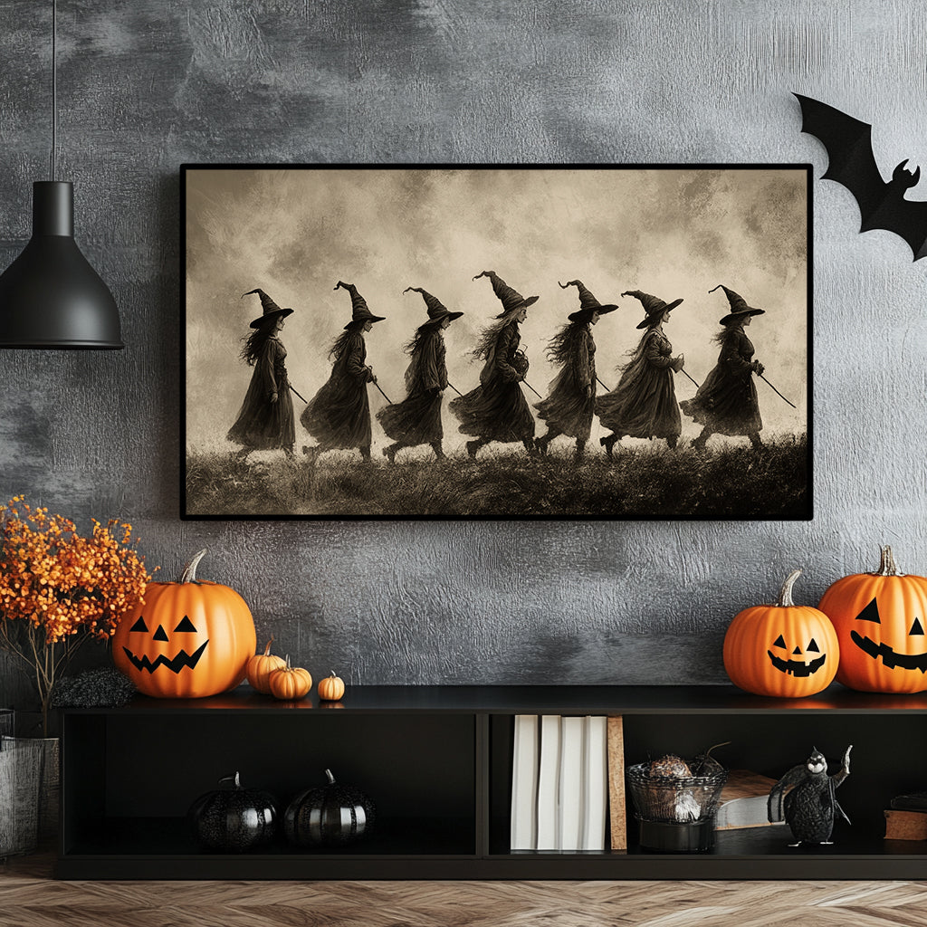 Witches Vintage Drawing Frame TV Art, Halloween Screensaver, wallpaper, available in 4K Ultra HD, it’s perfect for Samsung Frame TV and Smart TVs. It’s also compatible with a 16:9 ratio for commercial displays in stores, as well as personal use on wallpapers for office computers, laptops, and iPads.