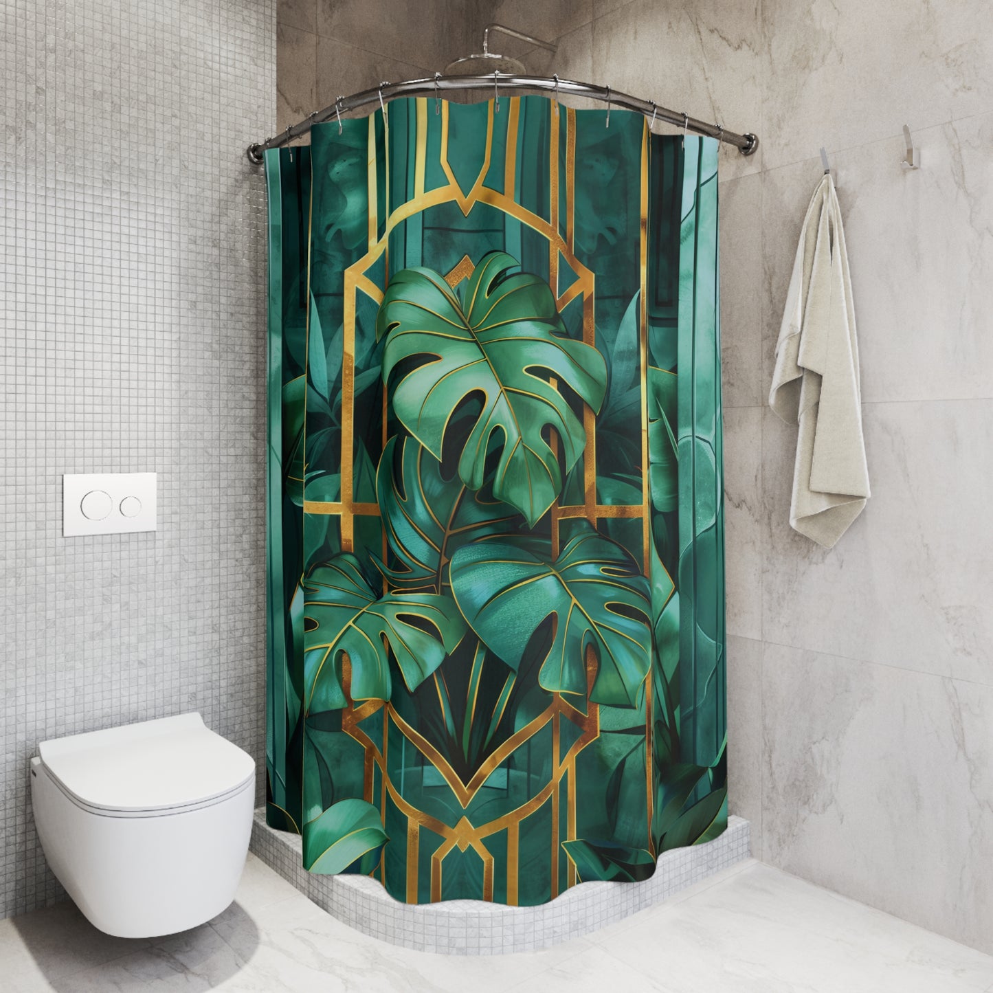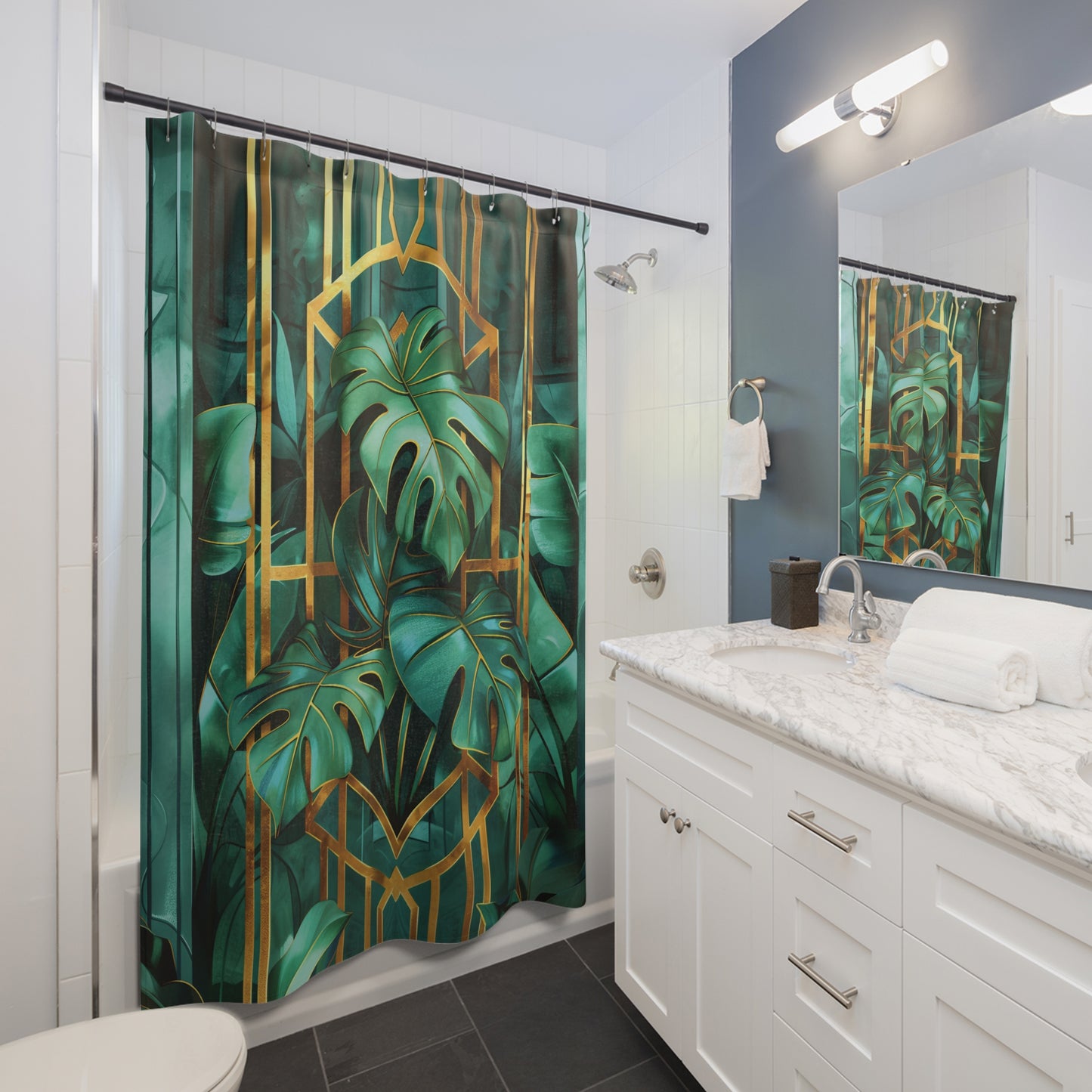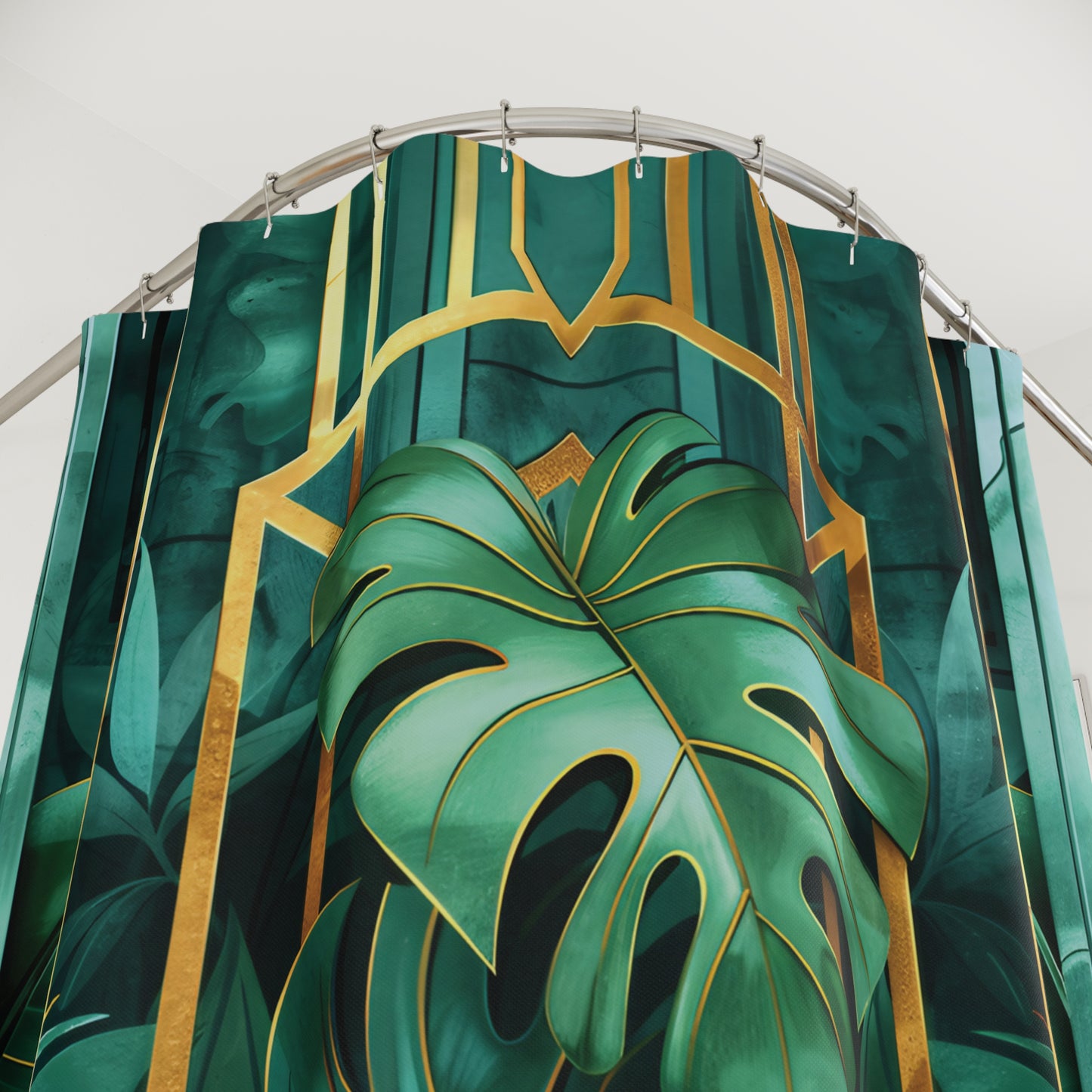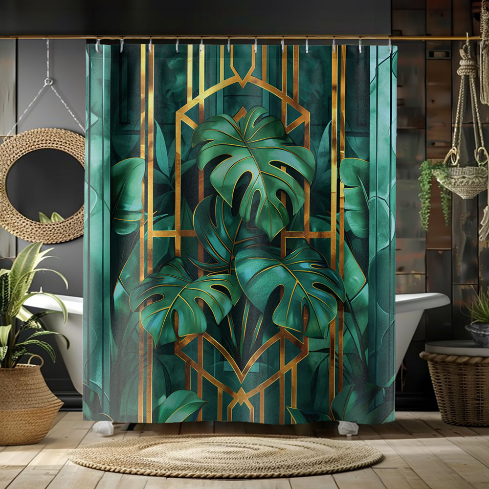 Embrace tropical vibes with this stunning curtain, Art Deco-style shower curtain. Adorned with tropical monstera leaves and captivating geometric patterns in teal, emerald green, and luxurious gold accents. Revitalize your space with elegance and sophistication.