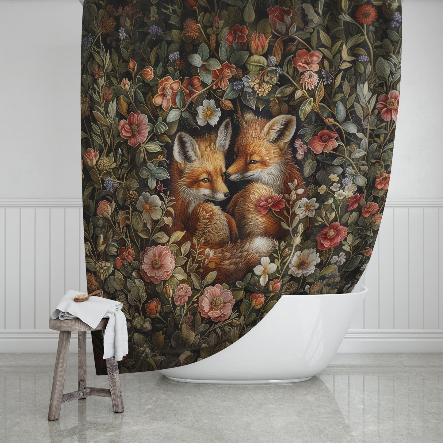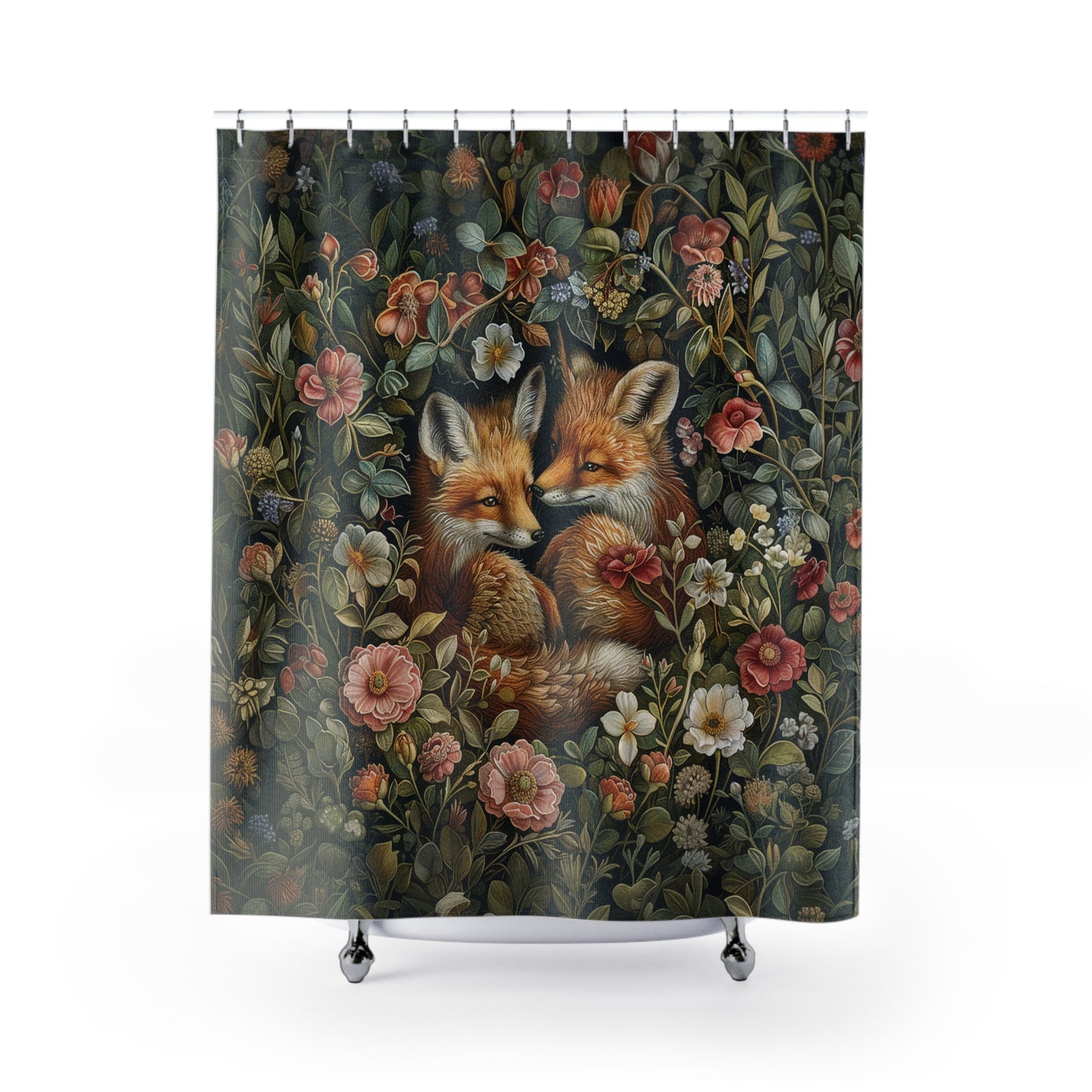 Enchanting Woodland Baby Foxes Shower Curtain, inspired by William Morris and adorned with two adorable fox cubs nestled amidst a garden of blooming flowers. Perfect for fox lovers and nature enthusiasts alike, it adds a touch of whimsical charm to any bathroom. Transform your space into a haven of innocence and beauty with this delightful shower curtain..