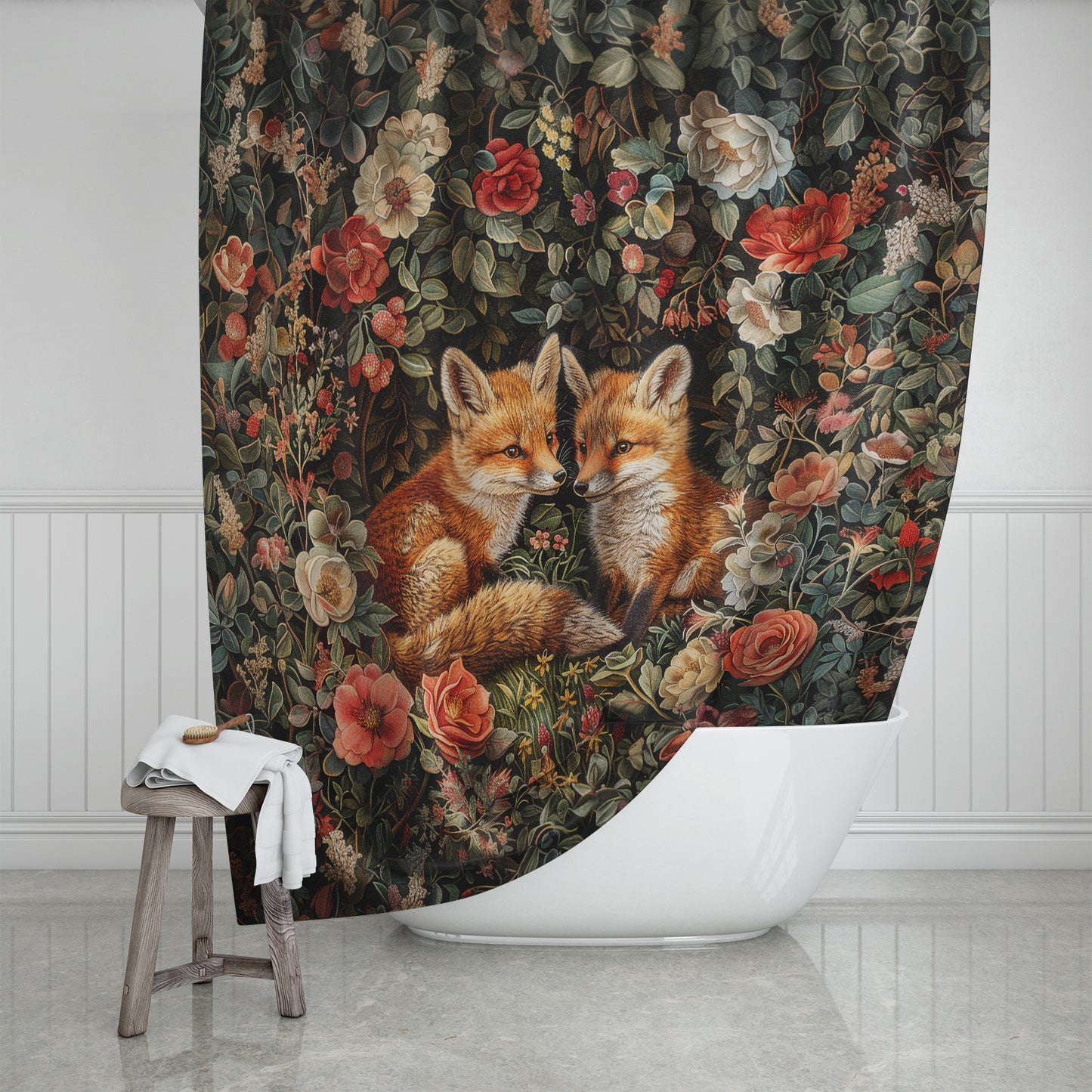 Enchanting Woodland Baby Foxes Shower Curtain, inspired by William Morris and adorned with two adorable fox cubs nestled amidst a garden of blooming flowers. Perfect for fox lovers and nature enthusiasts alike, it adds a touch of whimsical charm to any bathroom. Transform your space into a haven of innocence and beauty with this delightful shower curtain..