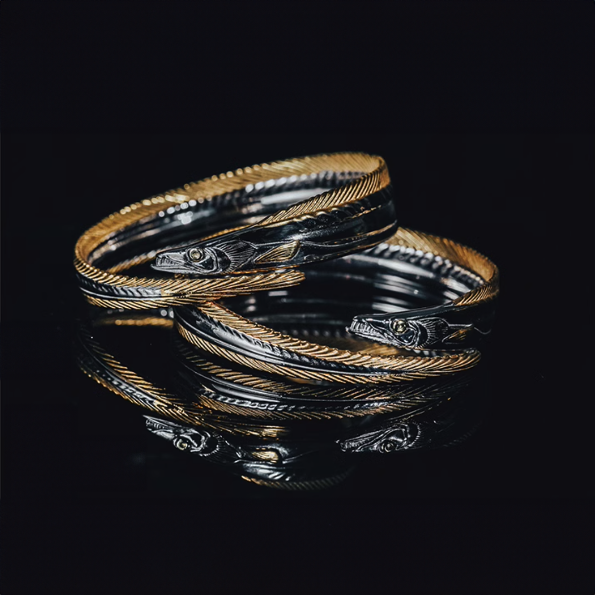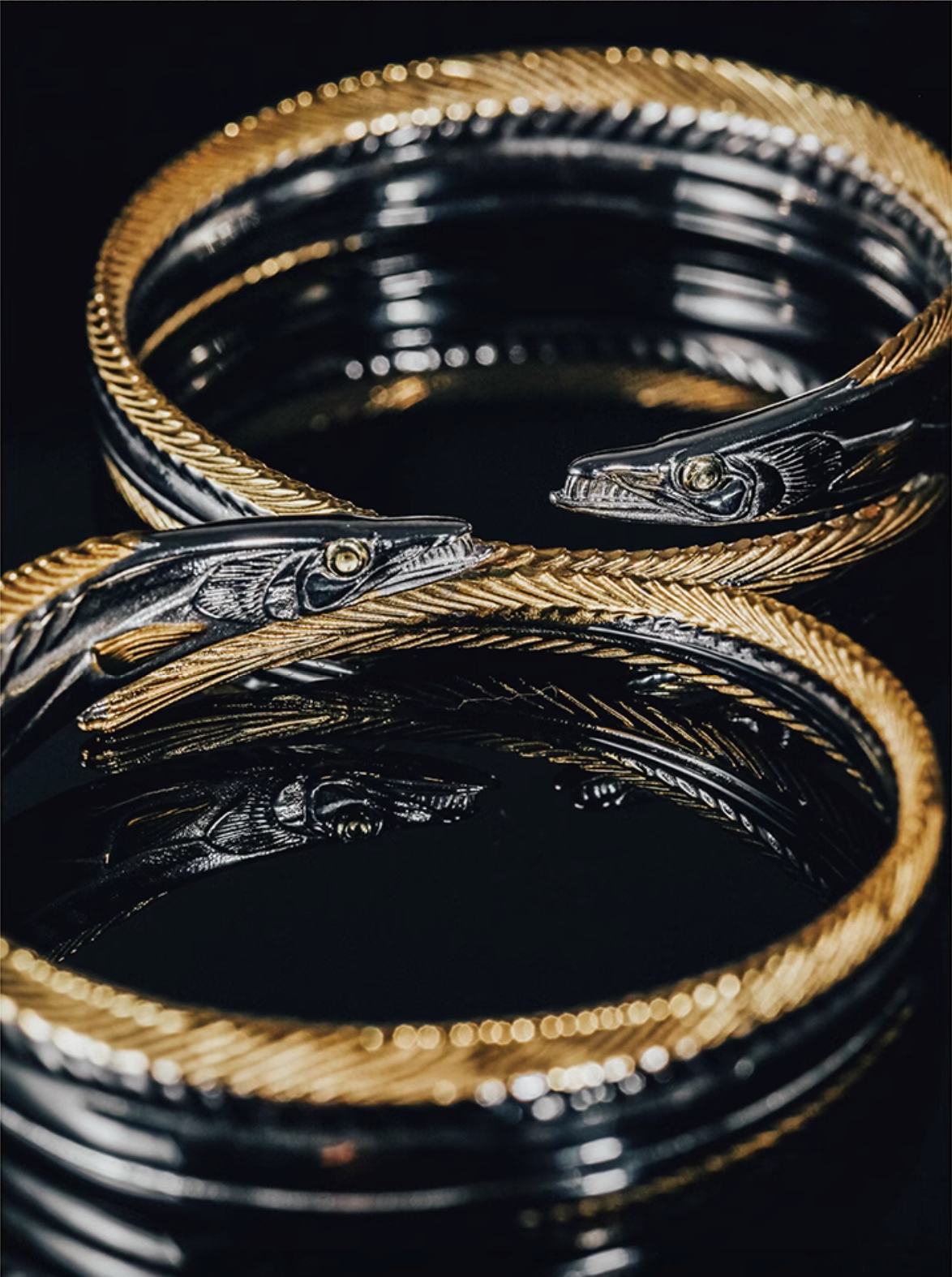 The bracelet features a meticulously crafted largehead hairtail design that wraps gracefully around your wrist, showcasing the fluid and dynamic lines of this majestic fish. The two-sided brass eyes add a touch of realism and depth, making the hairtail come to life with every movement.