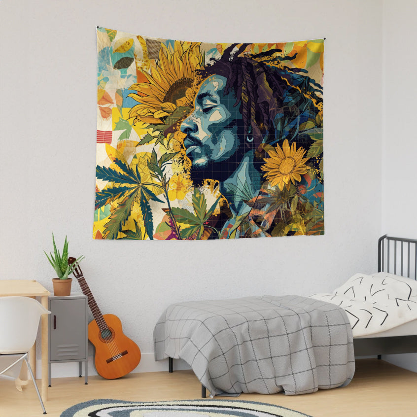 Reggae Music Bob Marley Floral Collage Tapestry, Jamaican reggae music Inspired, a captivating fusion of music and nature. Featuring a striking portrait of Bob Marley surrounded by sunflowers, this tapestry exudes warmth and positivity. Perfect for music lovers and those who appreciate unique decor, it adds a touch of artistic flair to any space. Whether as a statement piece in your home or a thoughtful gift for a friend, let the spirit of Bob Marley and the beauty of sunflowers inspire and uplift you every day.