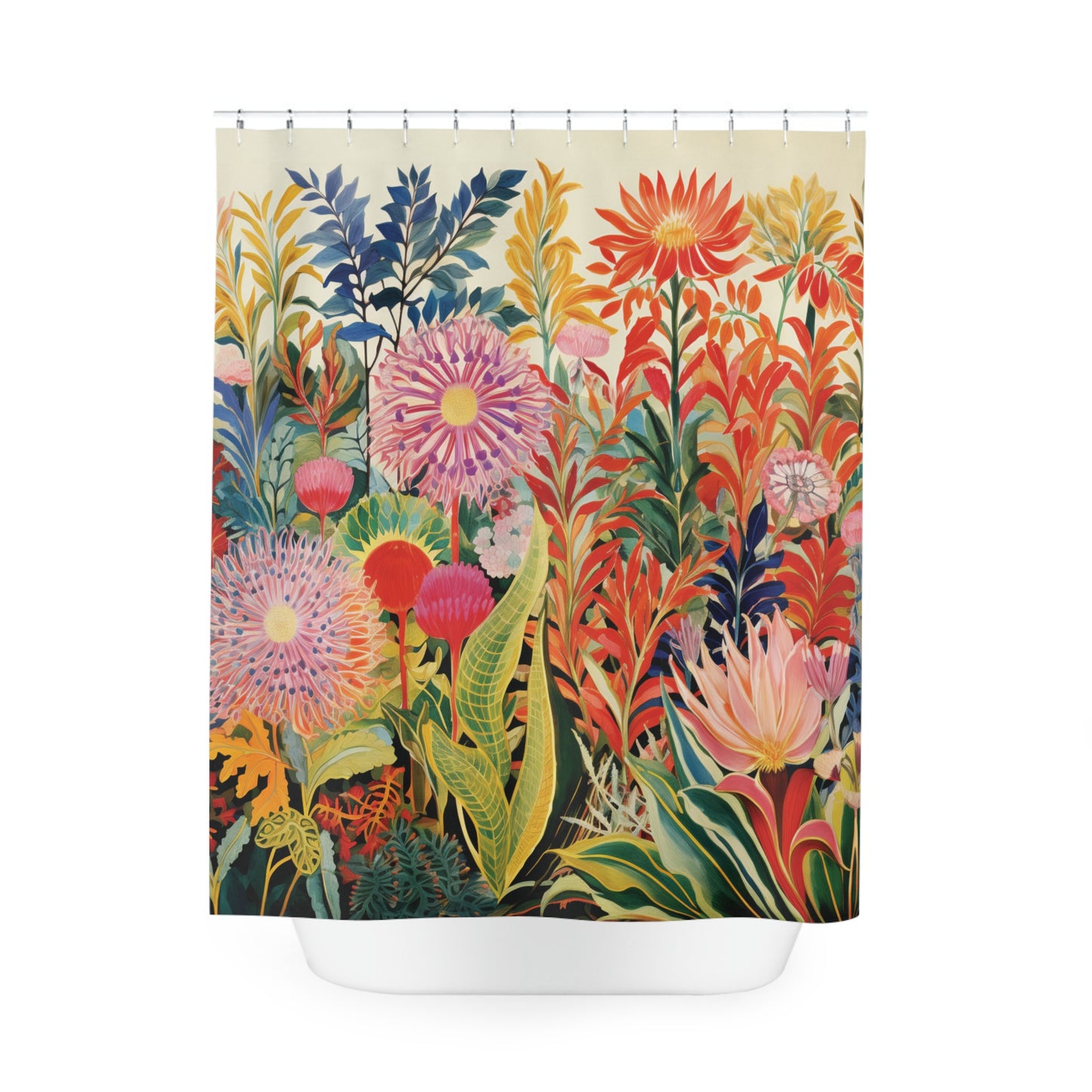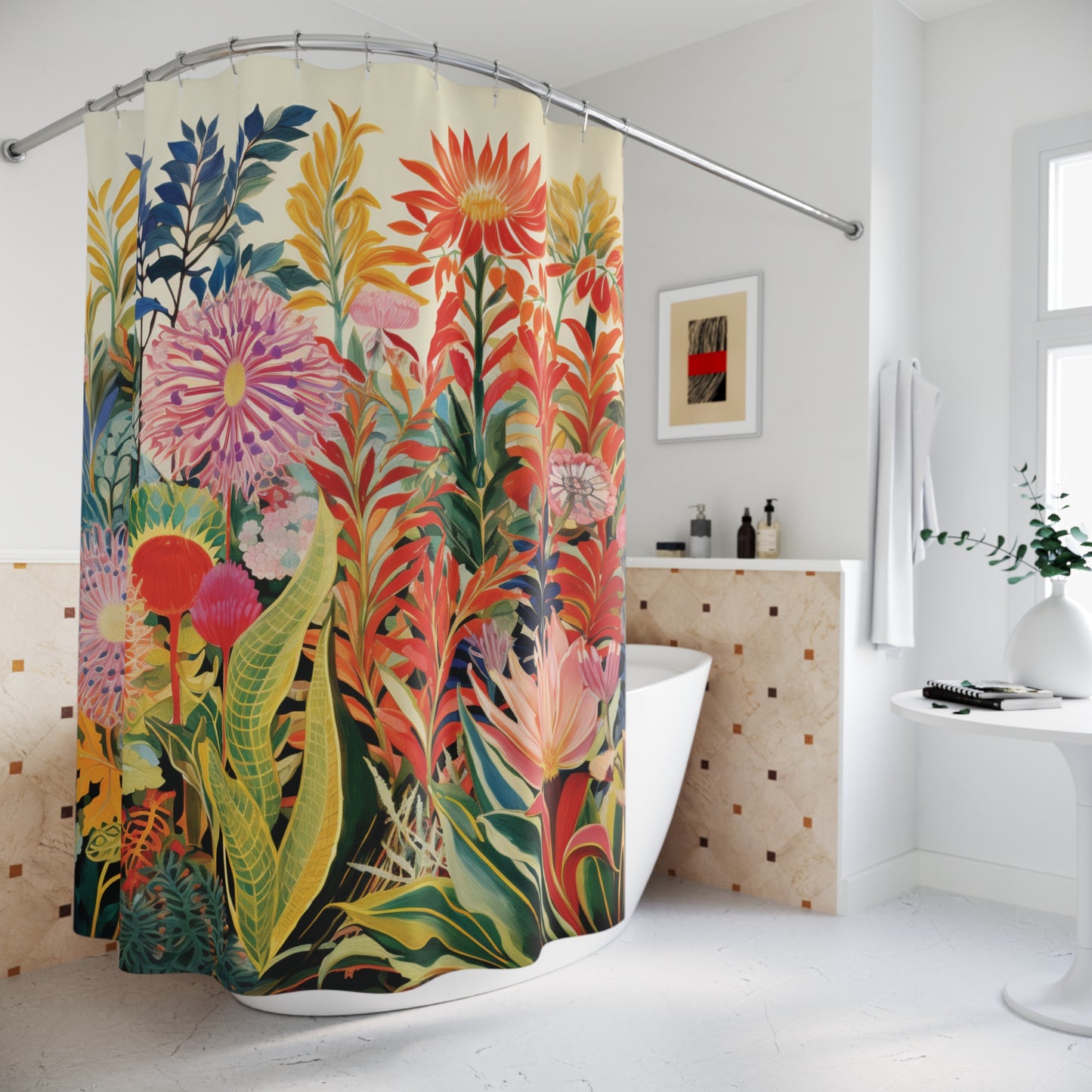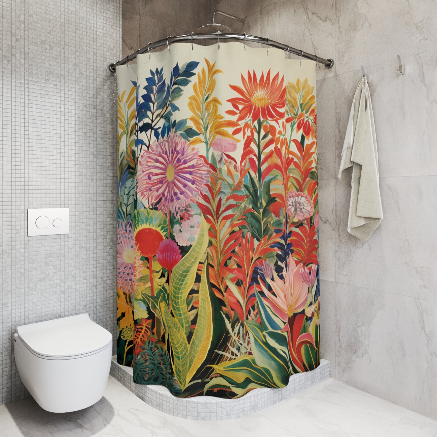 Each element of this lush garden scene is meticulously illustrated, capturing the delicate beauty of nature in full bloom. The interplay of bold, striking colors and intricate patterns brings a sense of energy and joy to your space, making every shower feel like a walk through a sunlit meadow.