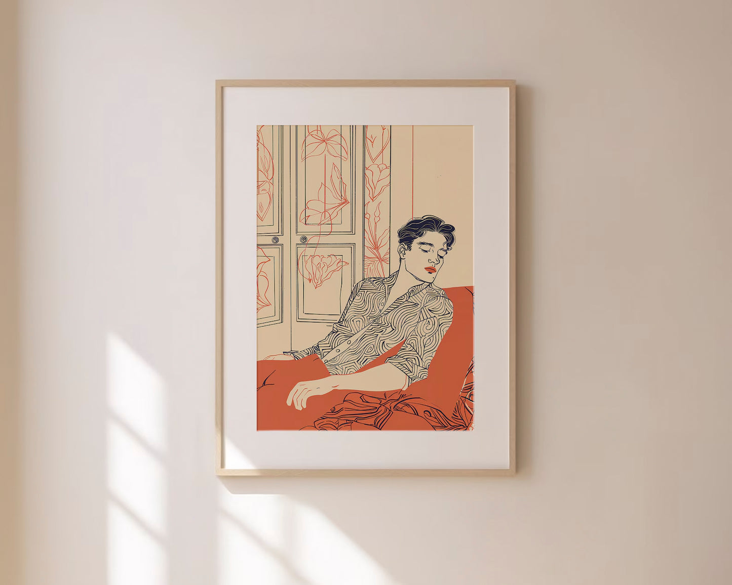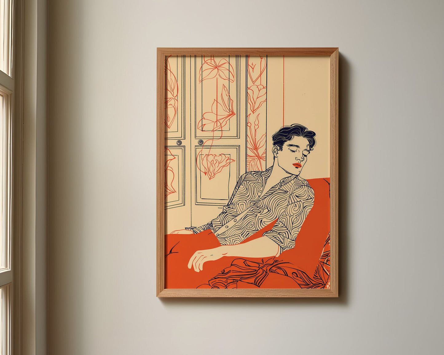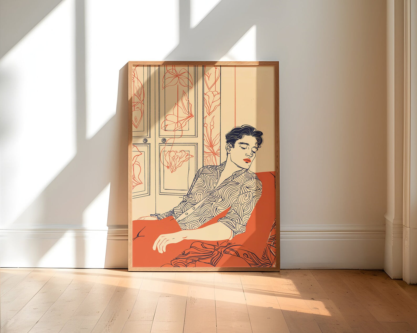 "Dorian" is an exquisite digital print that invites you into the serene world of a gorgeous guy at rest in his living room, portrayed with minimalist elegance. As a representation of Gay Art, this poster captures the essence of quietude and beauty, making it an ideal addition to your Home Decor Wall Art collection. The minimalist style of the artwork not only accentuates the subject's allure but also seamlessly integrates into a variety of living spaces. "Dorian" stands as a testament to the intersection of art and lifestyle, offering a perfect blend of sophistication and simplicity. Elevate your space with this captivating piece that celebrates the grace of repose.