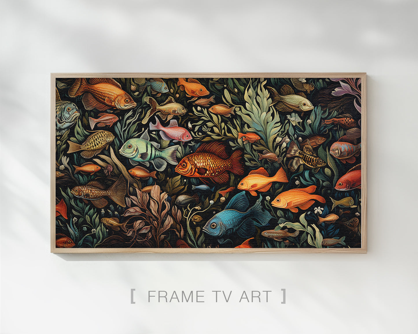 Fish Aquarium digital art with an antique white canvas texture. Available in 4K Ultra HD, it's perfect for Samsung Frame TV and Smart TV. Also compatible with a 16:9 ratio for displays, computers, laptops, and iPad wallpapers.