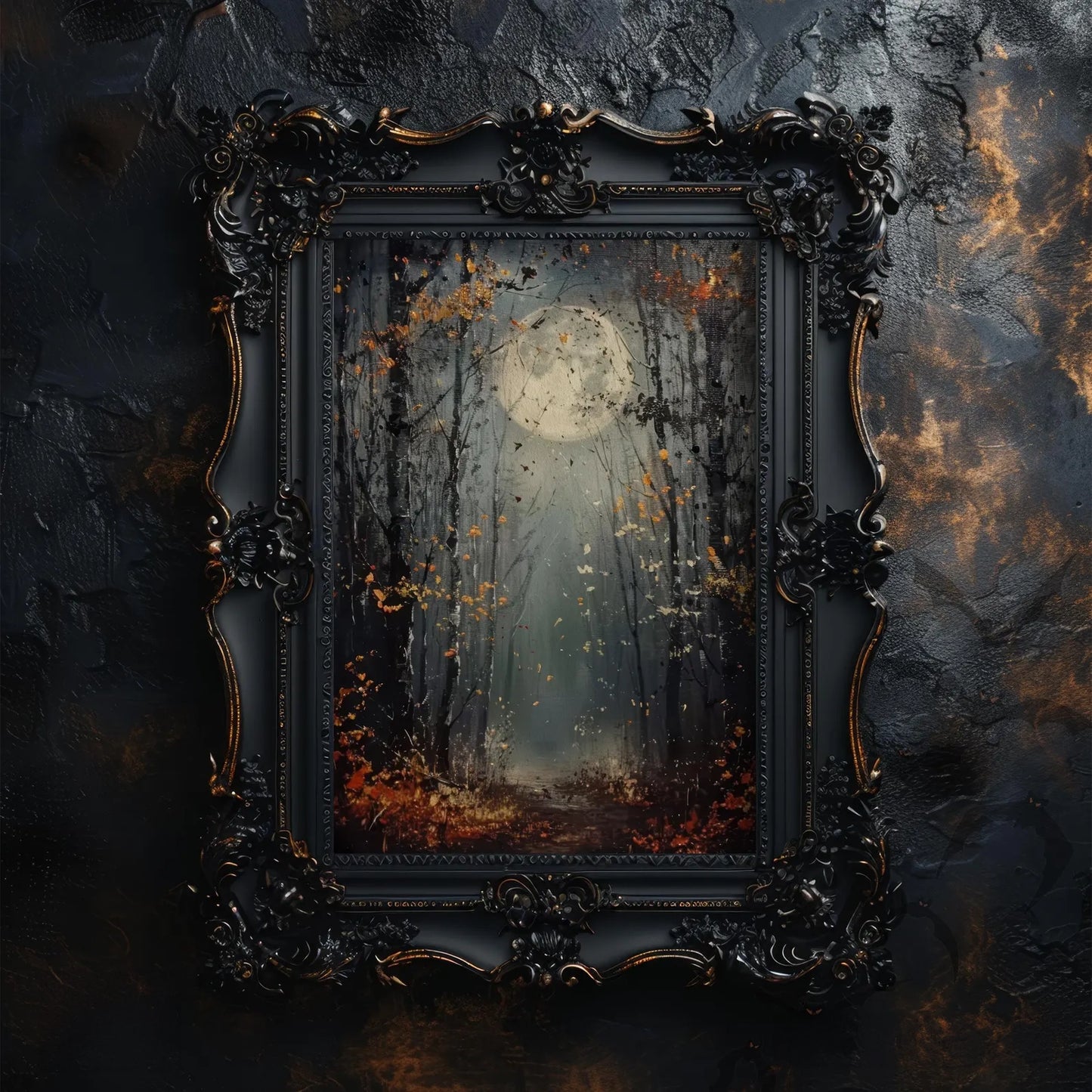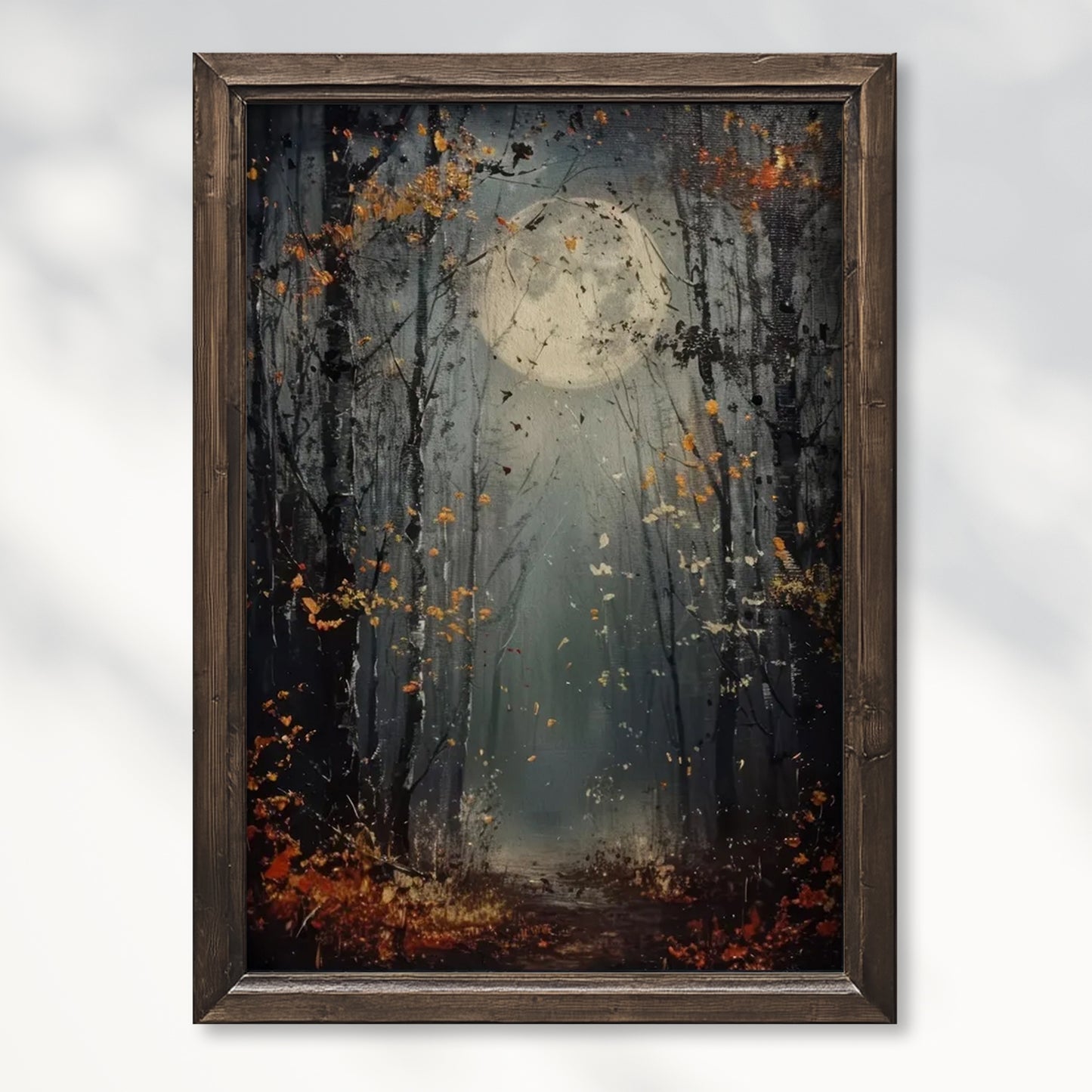 Capture the spooky magic of Halloween night with this stunning full moon shining over a dark autumn forest. The vintage-style oil painting draws you into the eerie stillness of the woods, with shadows and moonlight creating a mysterious vibe. Perfect for adding a touch of Halloween spirit to your space.