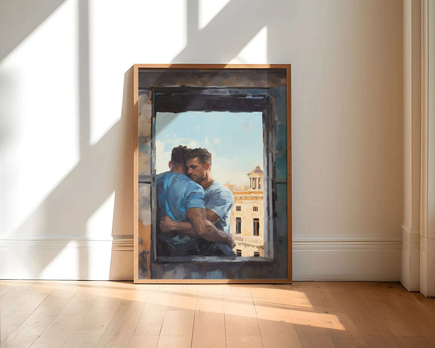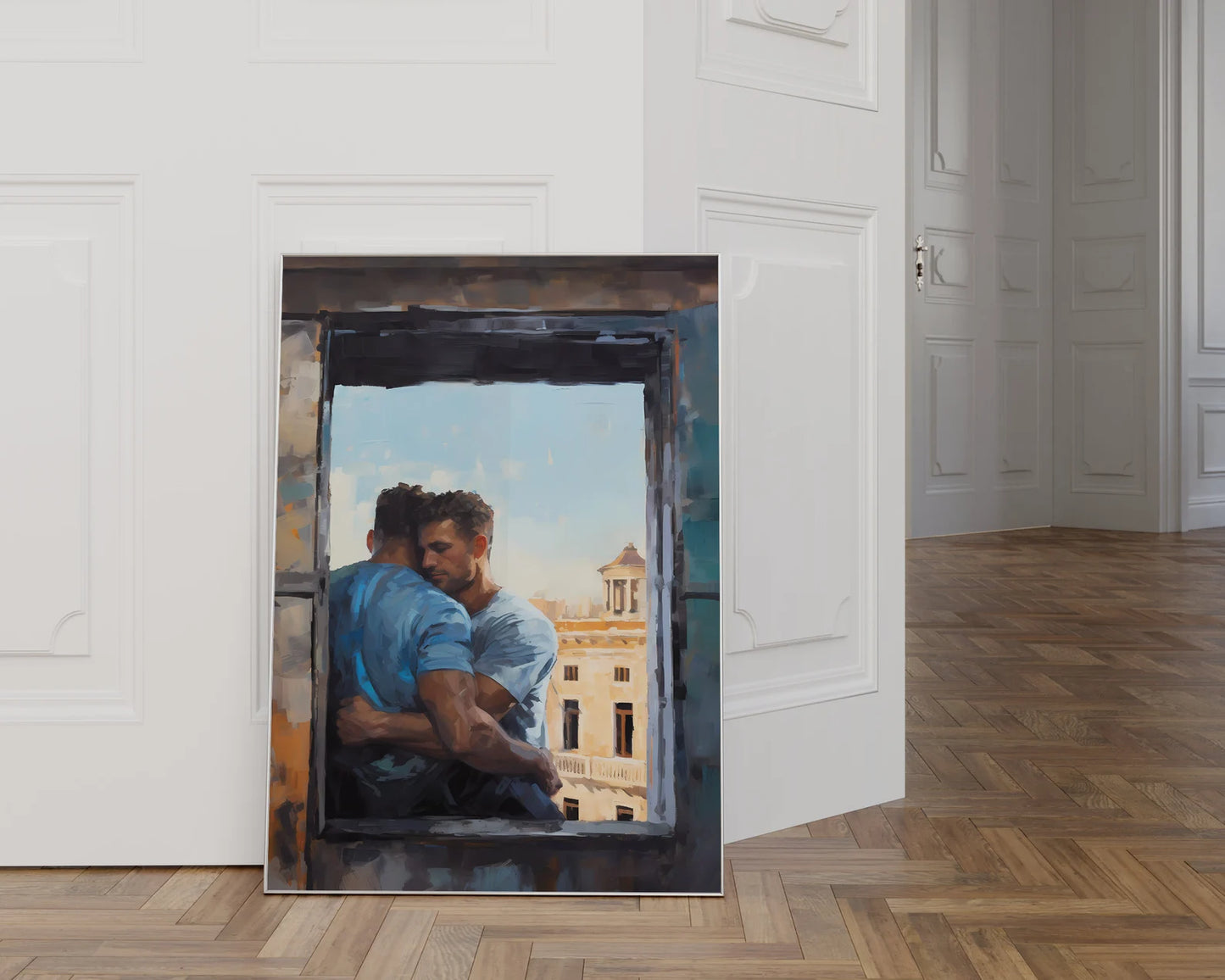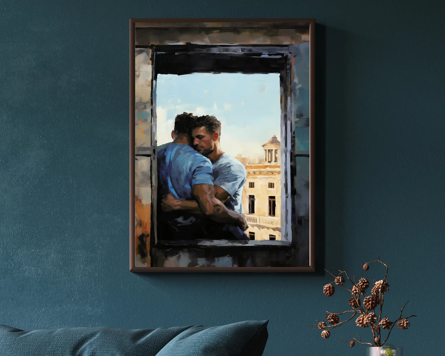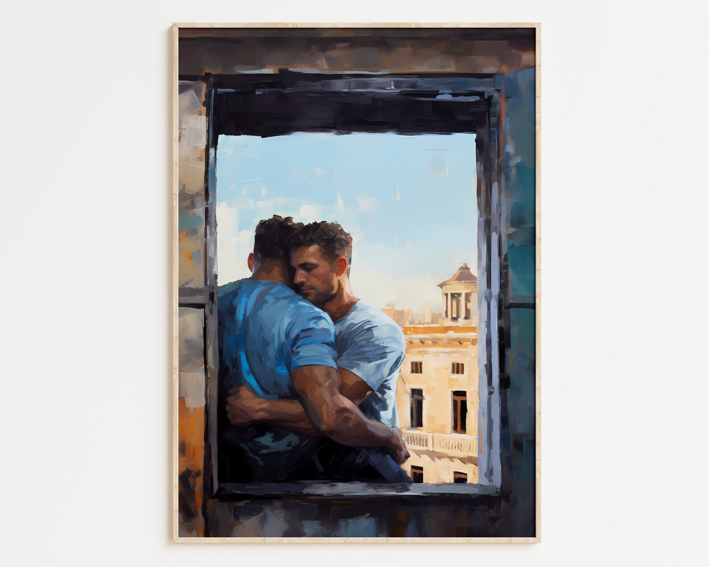 In this digital print, two lovers are depicted sharing a heartfelt and intimate hug by a window overlooking the enchanting cityscape of Rome. Created using the expressive Palette Knife Technique style, this artwork beautifully merges the warmth of their embrace with the timeless allure of the Eternal City. As a perfect couple's gift, this Gay Print Poster elegantly celebrates the power of love and the beauty of shared experiences, making it a meaningful addition to any home decor. Display this wall art with pride, allowing it to evoke a sense of love, togetherness, and the timeless allure of romance against the backdrop of a stunning cityscape, forever preserved in this visually striking masterpiece.
