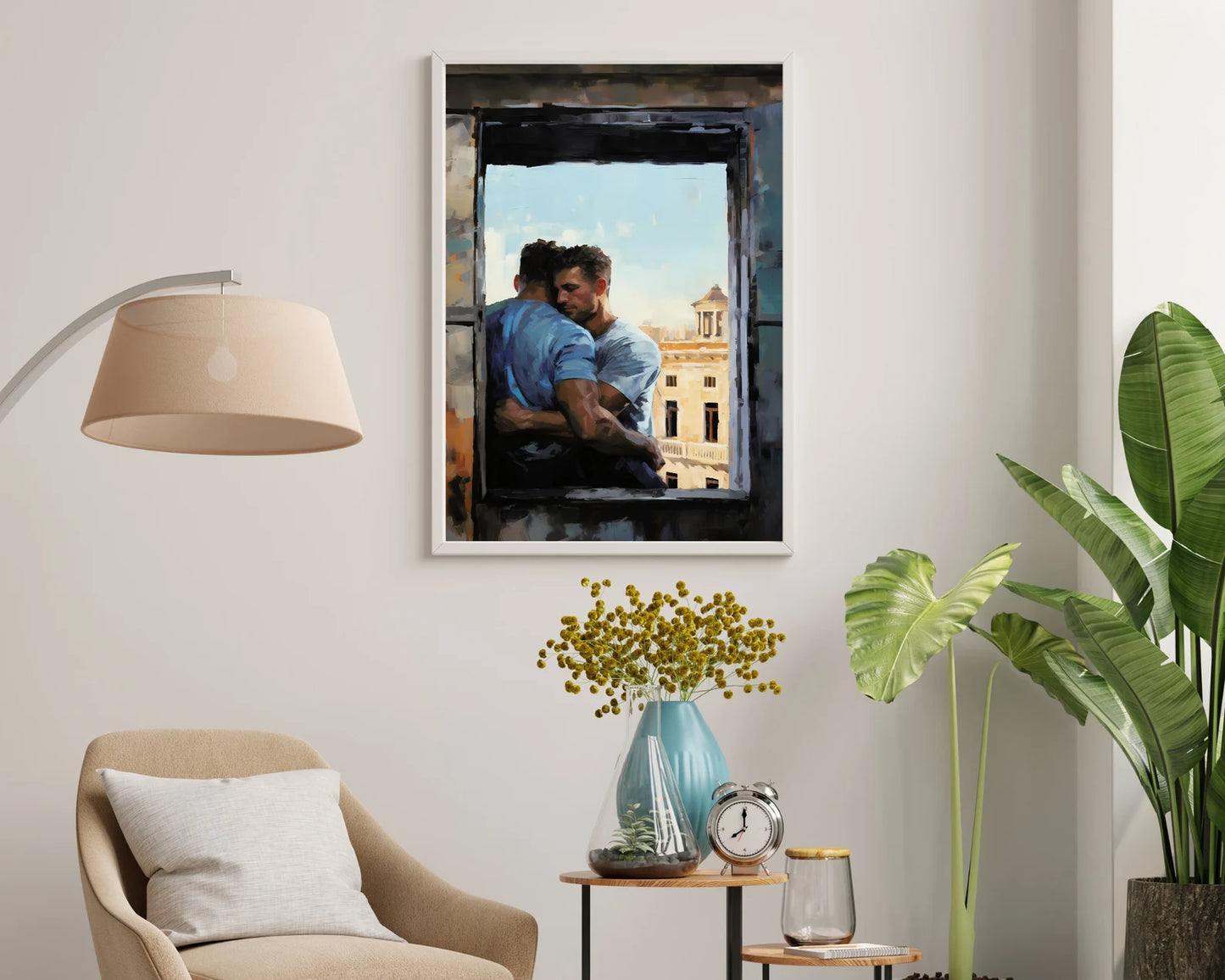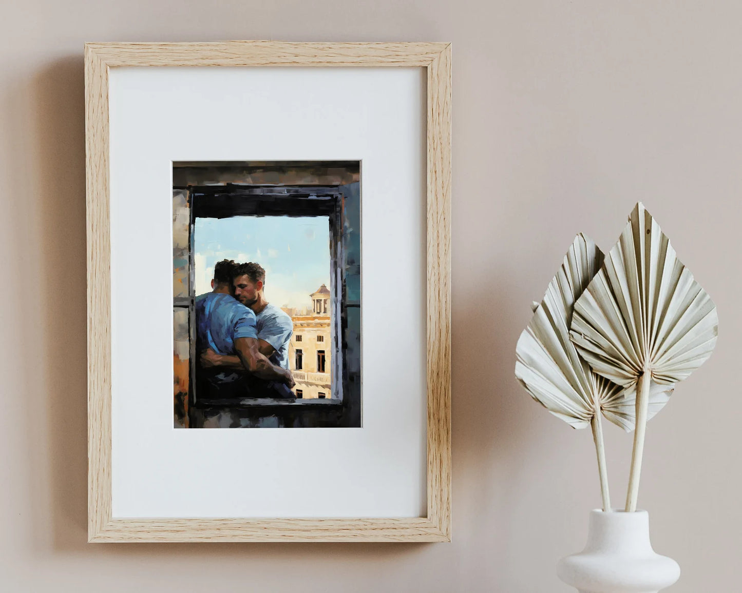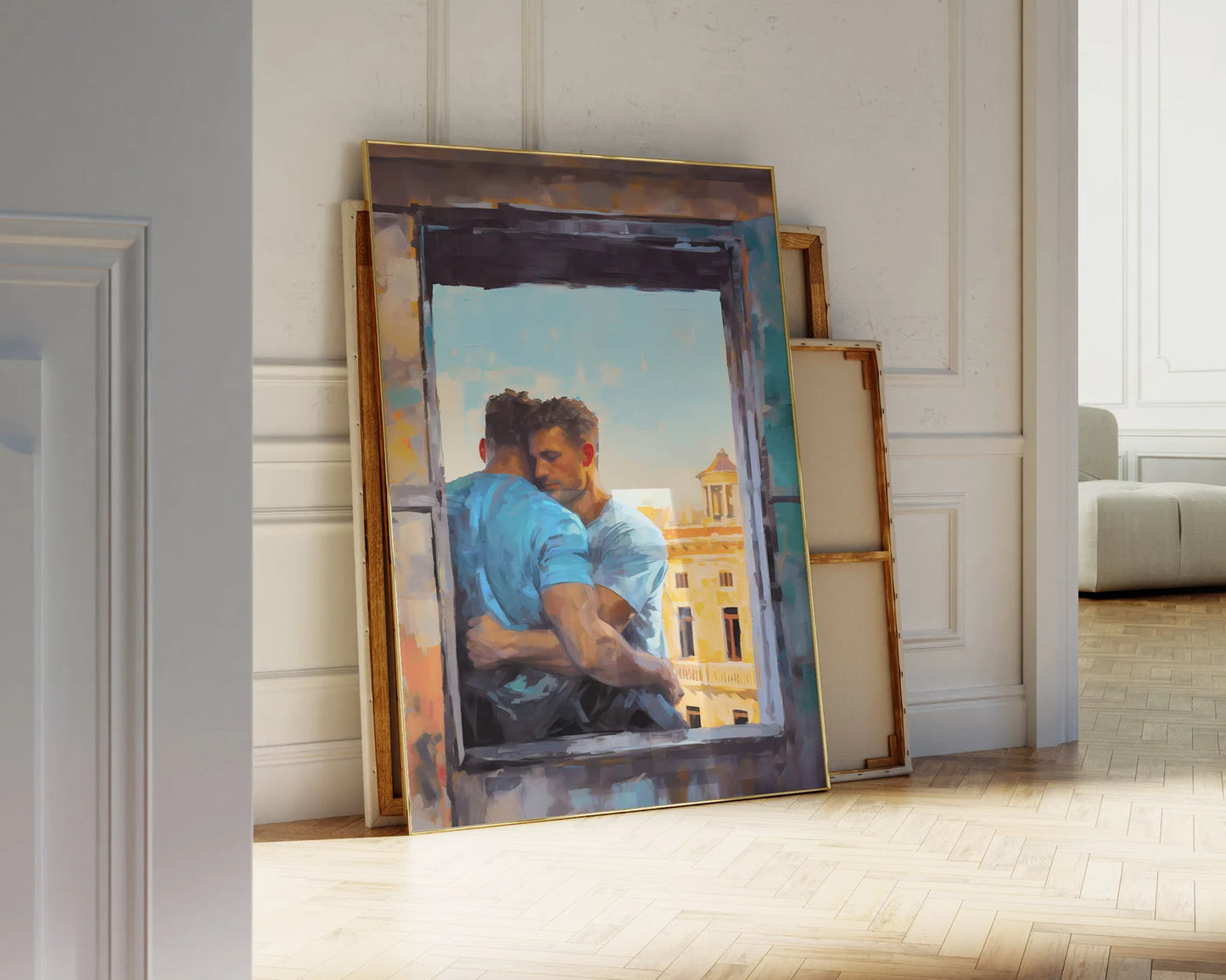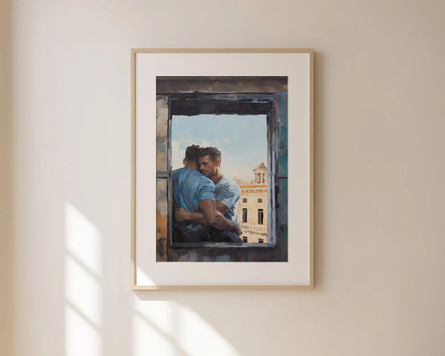 In this digital print, two lovers are depicted sharing a heartfelt and intimate hug by a window overlooking the enchanting cityscape of Rome. Created using the expressive Palette Knife Technique style, this artwork beautifully merges the warmth of their embrace with the timeless allure of the Eternal City. As a perfect couple's gift, this Gay Print Poster elegantly celebrates the power of love and the beauty of shared experiences, making it a meaningful addition to any home decor. Display this wall art with pride, allowing it to evoke a sense of love, togetherness, and the timeless allure of romance against the backdrop of a stunning cityscape, forever preserved in this visually striking masterpiece.