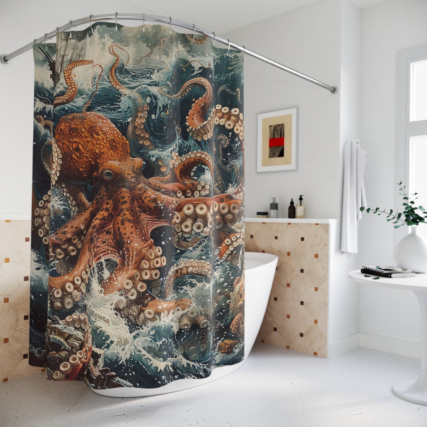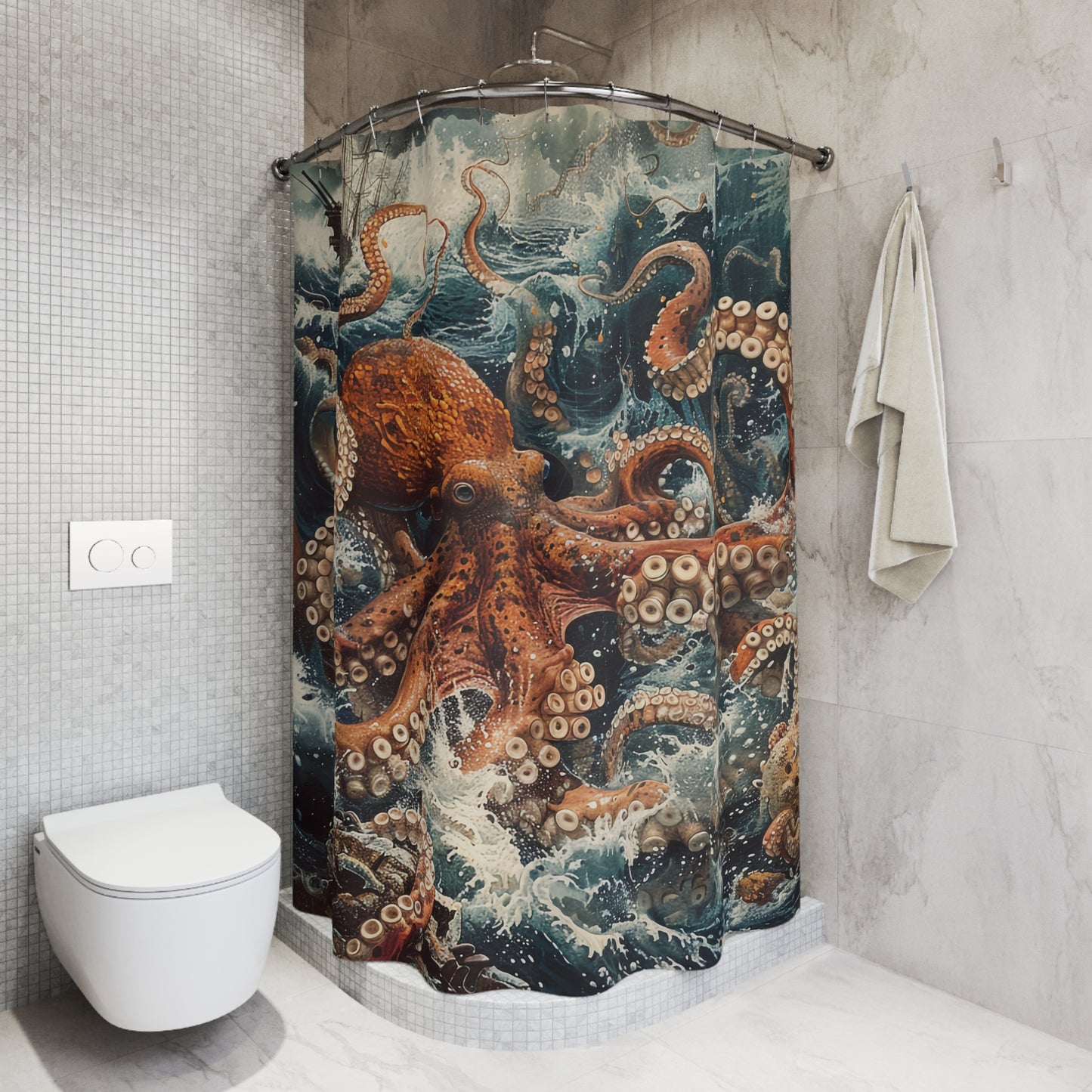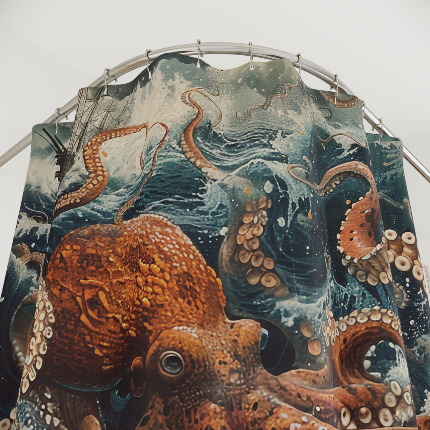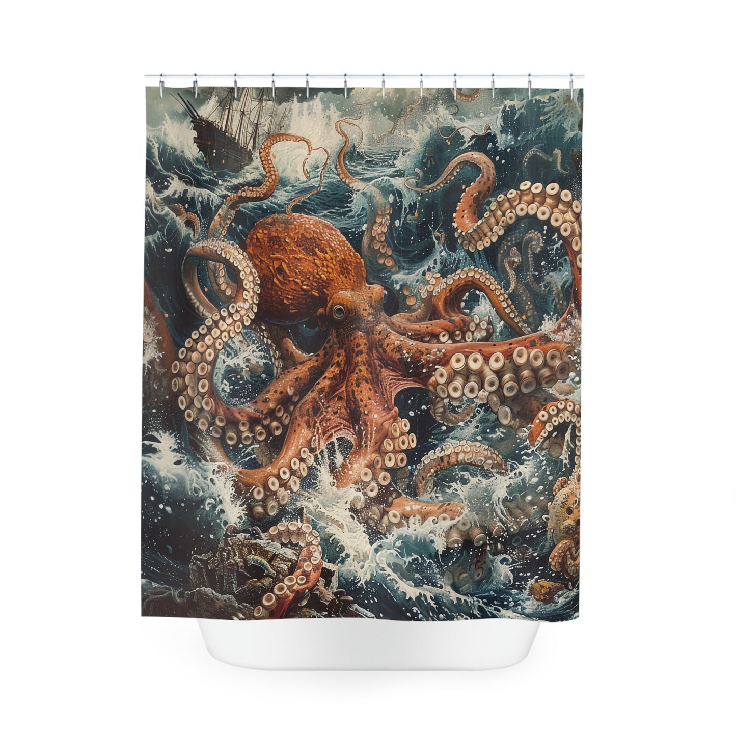 Dive into a world of fantasy and intrigue with this mesmerizing Kraken shower curtain. Perfect for sparking conversations and inspiring imaginations, it's a must-have for any ocean lover or myth enthusiast.