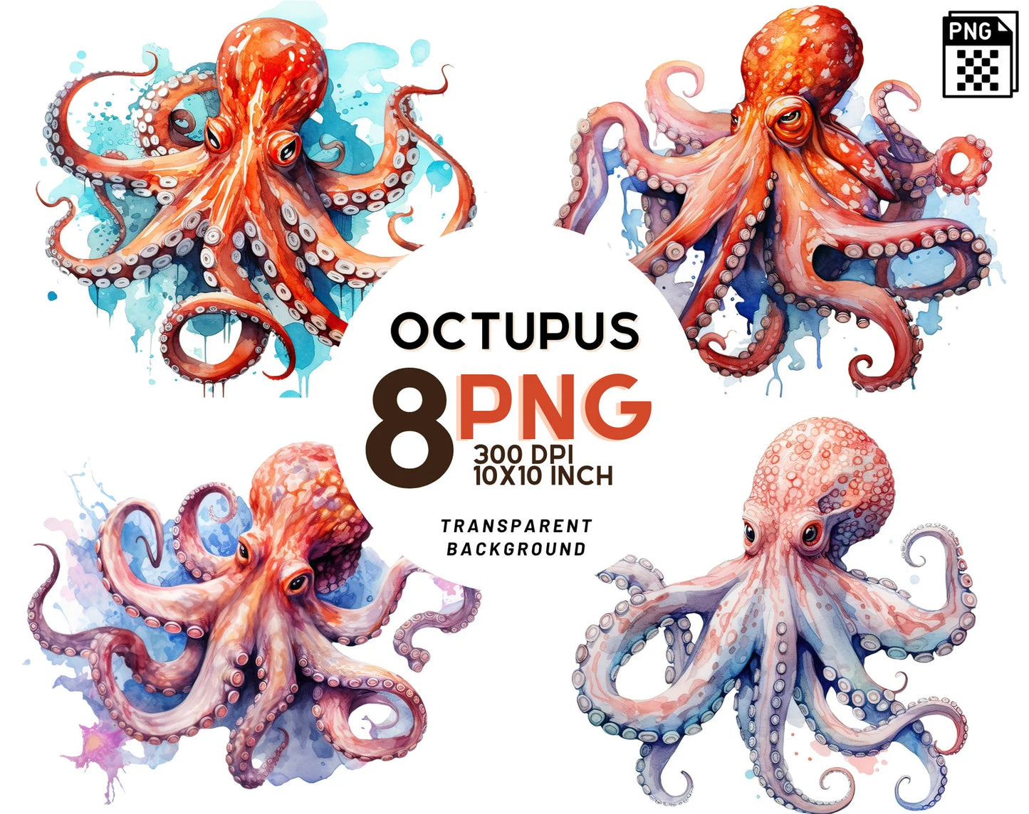 With exquisite attention to detail and a unique watercolor style, these Octopus illustrations will add a touch of whimsy and sophistication to your designs. Download this set today and let the magic of the ocean inspire your creativity!