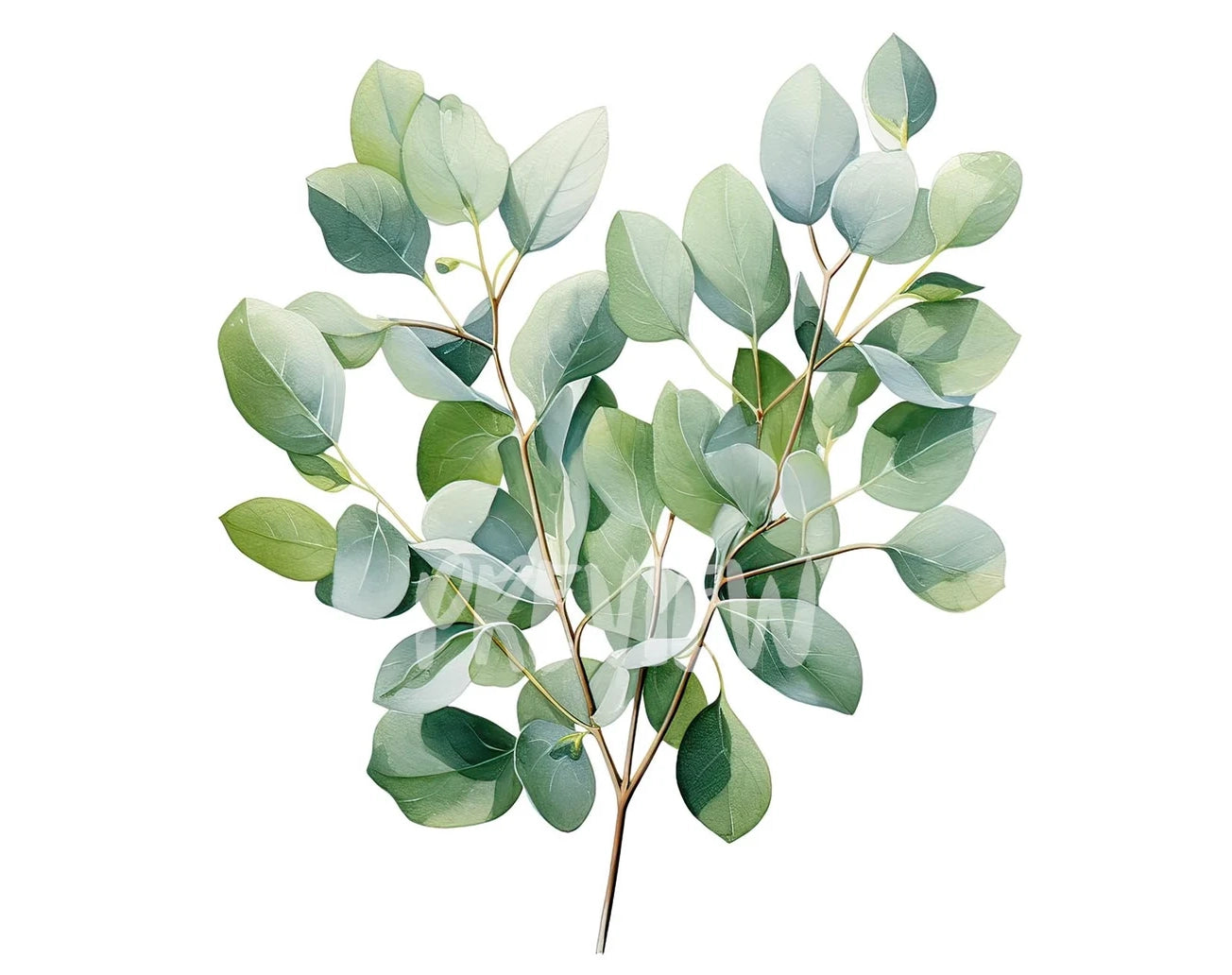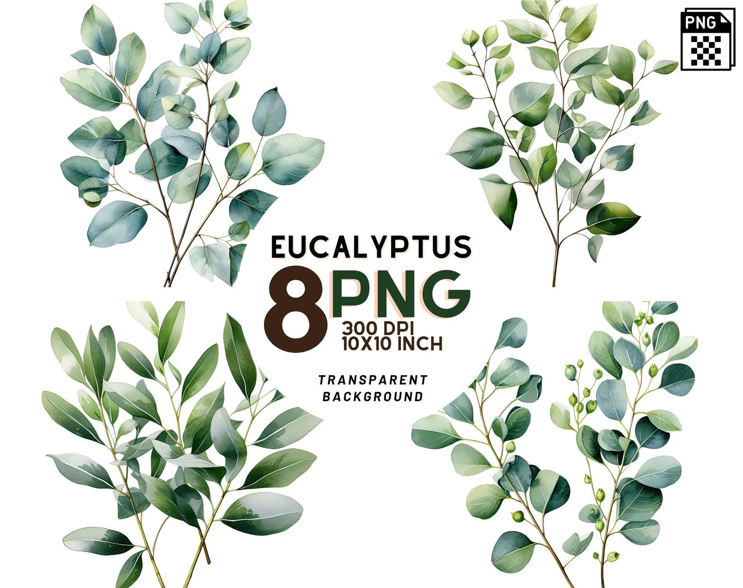 Eucalyptus, known for its therapeutic properties and invigorating scent, brings a sense of calm and rejuvenation to any space. With this in mind, this clipart set is an ideal addition to your designs, perfect for projects that promote relaxation, wellness, and a connection to nature.