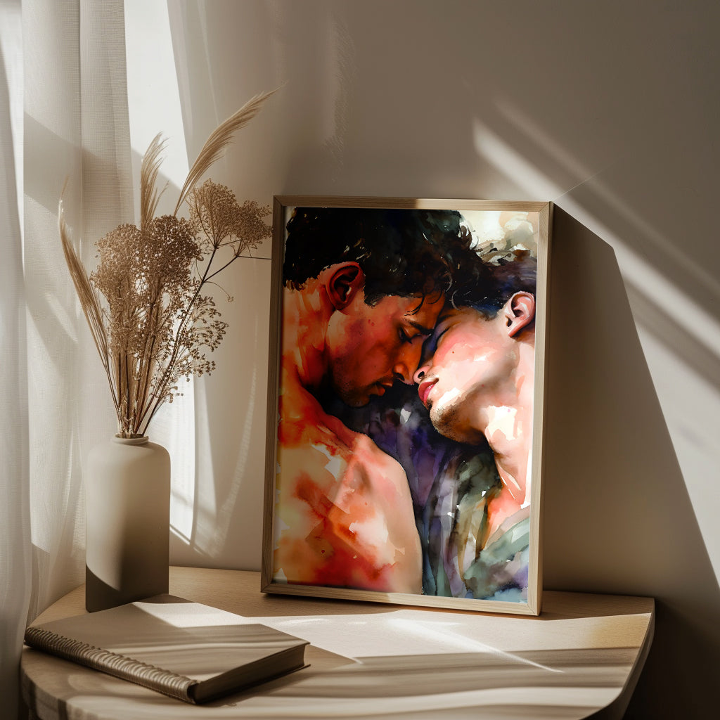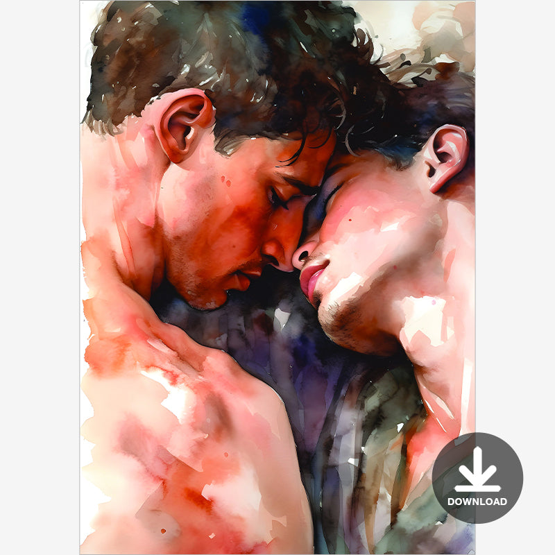 Watercolour painting of two men kissing. Download and print at your convenience, whether at home or at a local shop in your area.