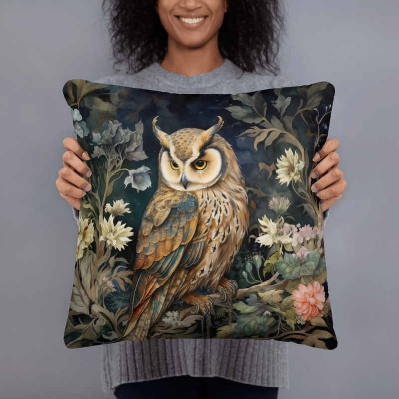 Step into the enchanting world of nature with vintage Woodland Owl illustration pillow. Add a touch of sophistication to your home decor as this wise owl graces your space amid a tranquil floral setting. Experience the perfect fusion of artistry and nature, bringing an elegant charm to every nook of your home.