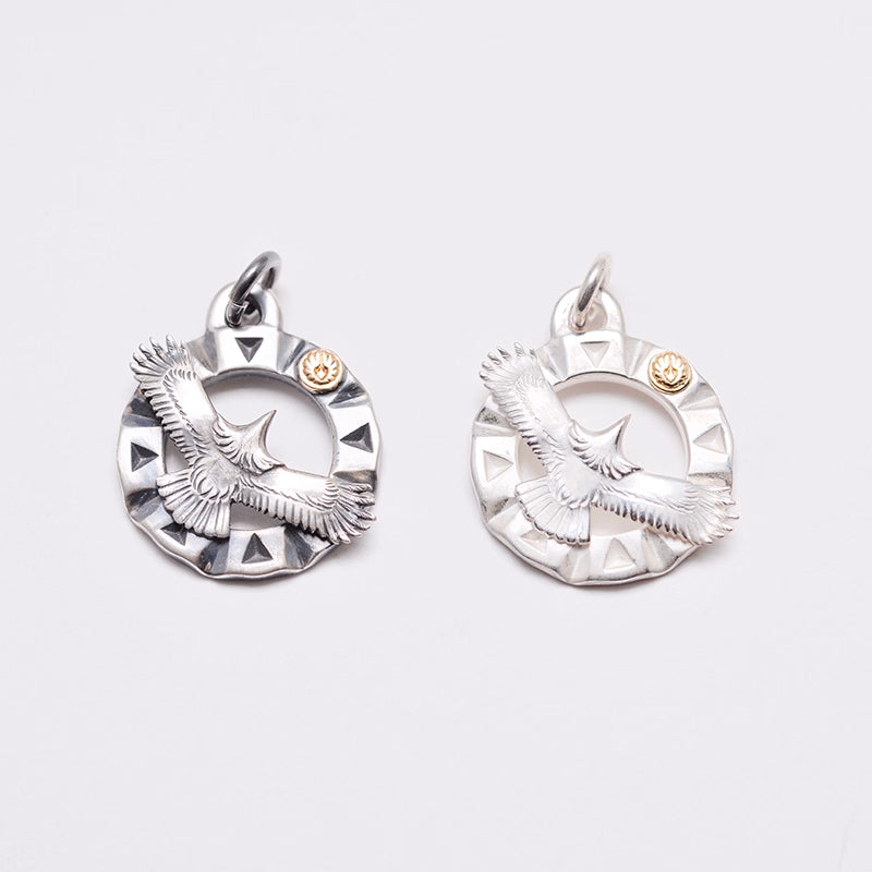 Embrace the spirit of freedom and elegance with our exquisite Handcrafted Sterling Silver Bird in Flight Pendant. This stunning piece captures the dynamic grace of a bird soaring through the skies, its wings beautifully extended within a circular frame. The intricate details of the bird are accentuated by a striking geometric pattern of triangular shapes, adding depth and visual intrigue to the design. A touch of warmth and luxury is introduced with a delicate 18k gold sunburst disc, meticulously crafted to complement the sterling silver. This elegant accent symbolizes enlightenment and vitality, perfectly enhancing the overall aesthetic of the pendant.