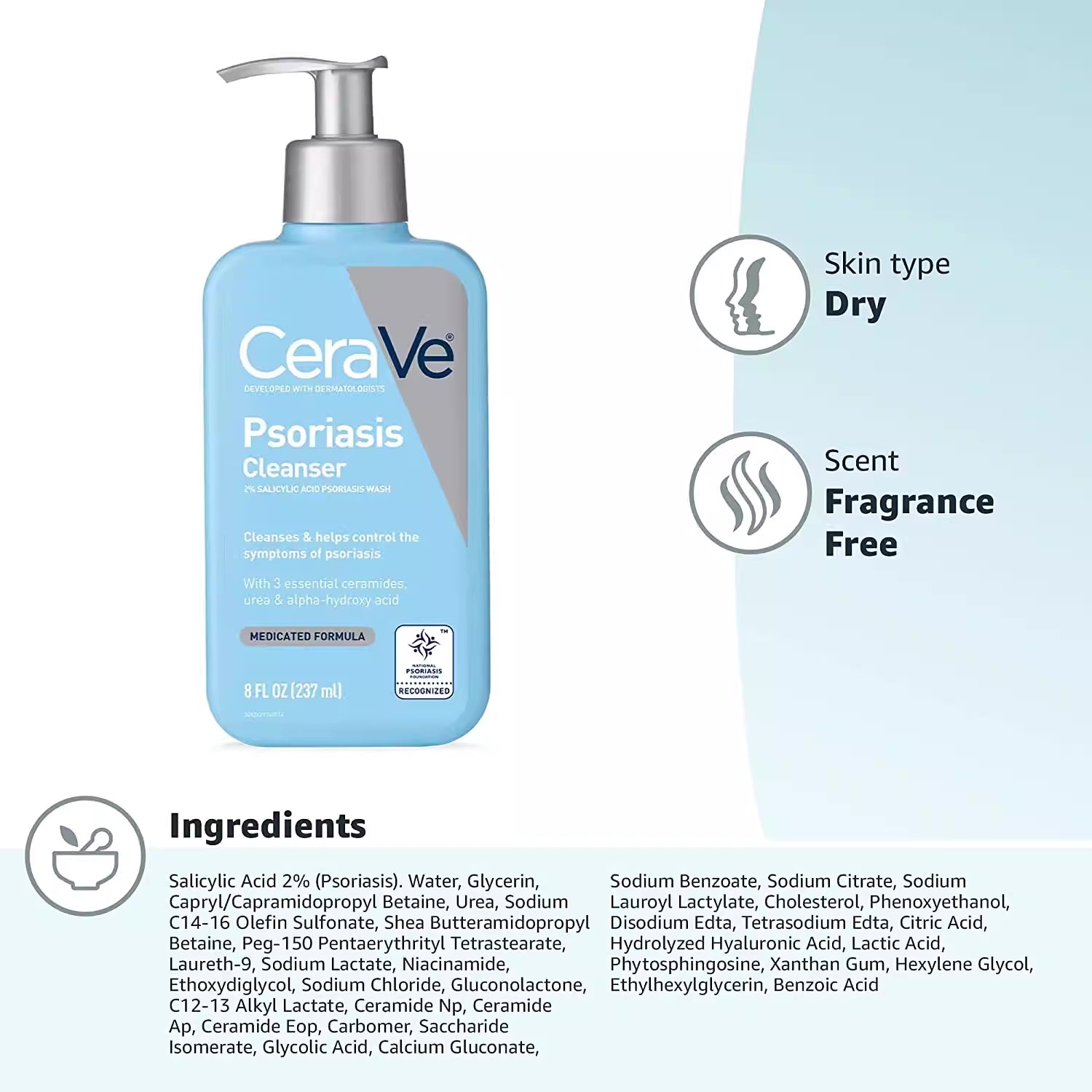 CeraVe Cleanser for Psoriasis, With Salicylic Acid for Dry Skin Itch Relief & Latic Acid for Exfoliation, Fragrance Free & Allergy Tested, 237g (8 oz) 美國原廠 Made in USA