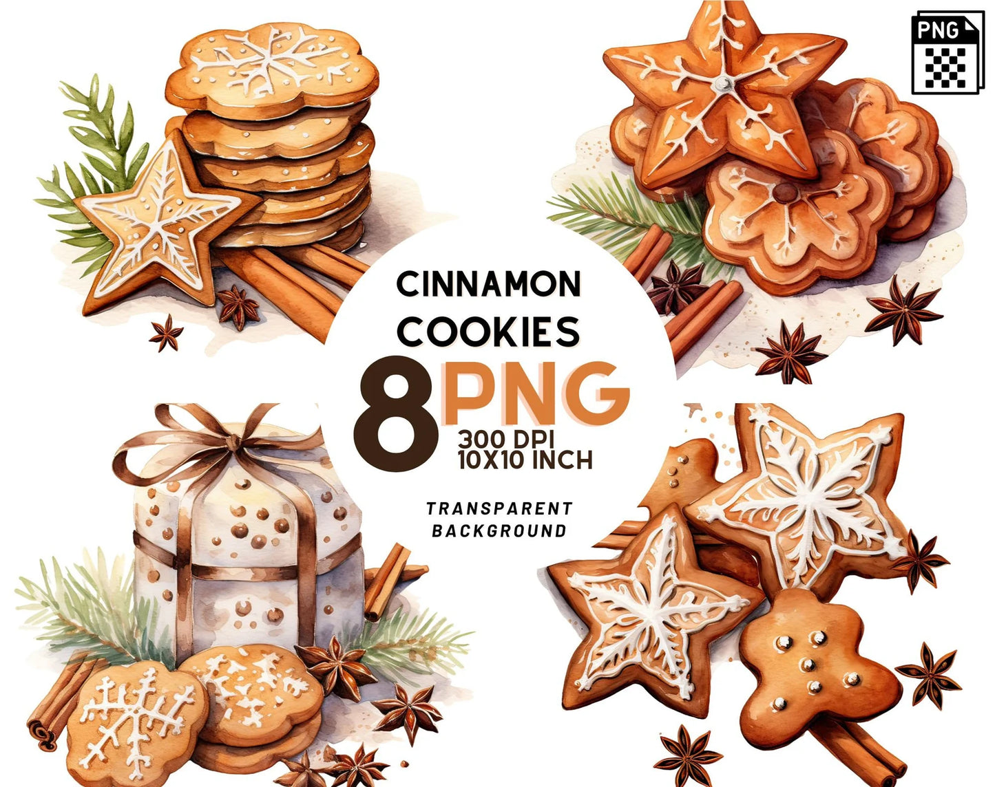Indulge in the delightful aroma and delicious taste of cinnamon cookies with this enticing clipart set. Each image showcases mouthwatering cookies adorned with a dusting of cinnamon, perfect for adding a touch of warmth and sweetness to your projects. Incorporate these images to create unique and personalized designs, including recipe cards, baking blogs, holiday-themed graphics, and more.