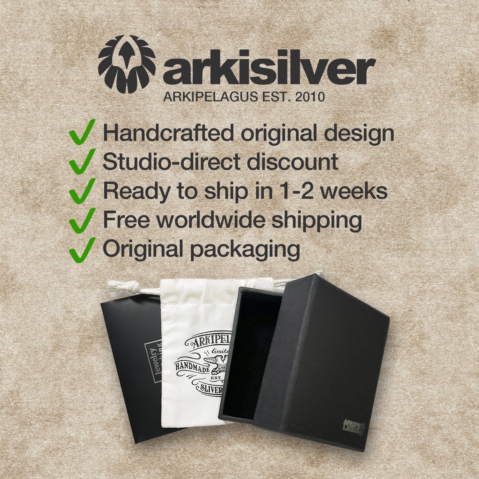 ARKI Silver (Arkipelagus) - based in Hong Kong. Even when sold through white-label studios or resellers in the US, all ARKI jewelry is still made exclusively at the original studio. These resellers typically need 2–3 weeks just to prepare for shipping, as they must first receive the item from ARKI before forwarding it to buyers — unless they have in-stock items on hand.