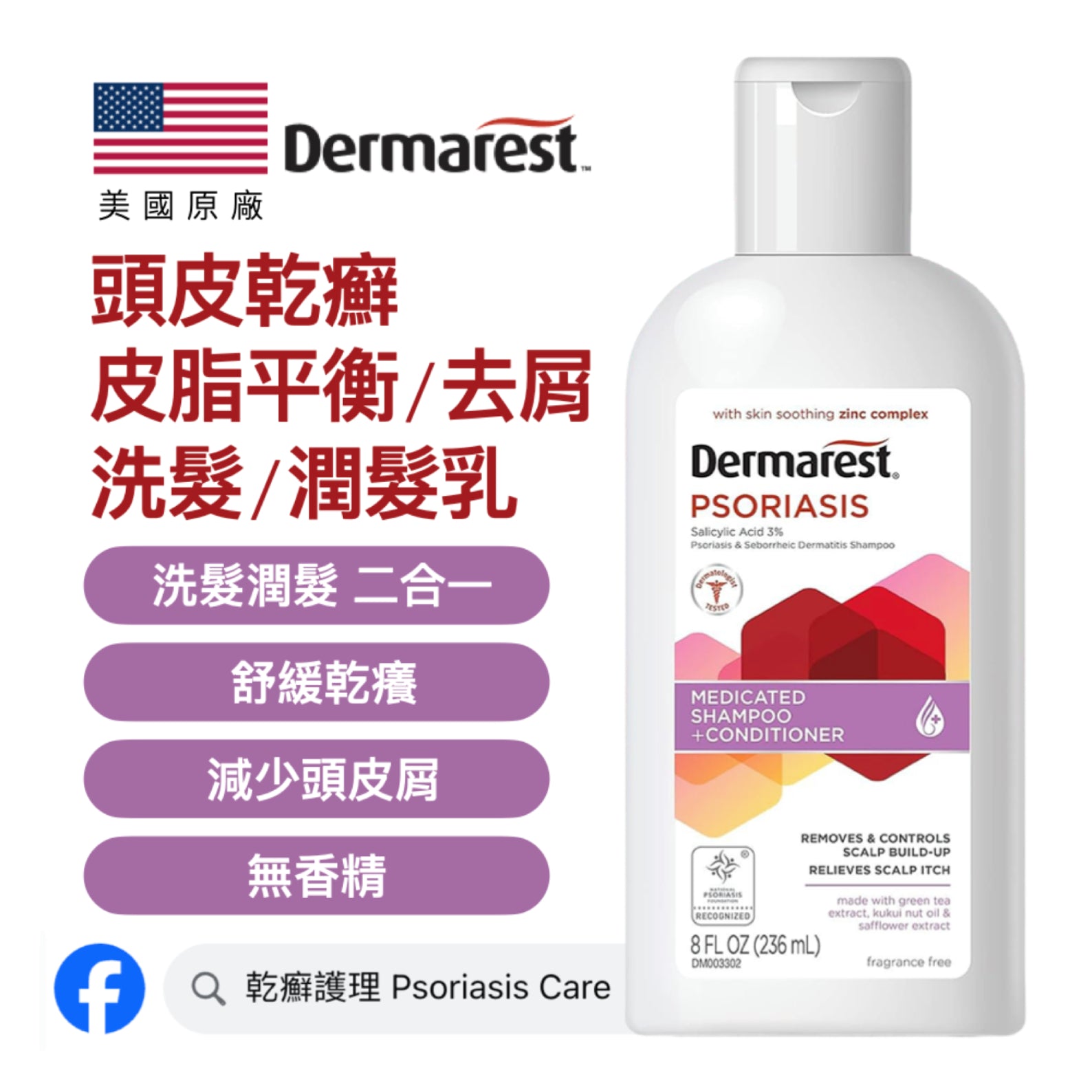 美國 Dermarest 頭皮乾癬 皮脂平衡 3%水楊酸 二合一洗髮潤髮乳 (補貨中)