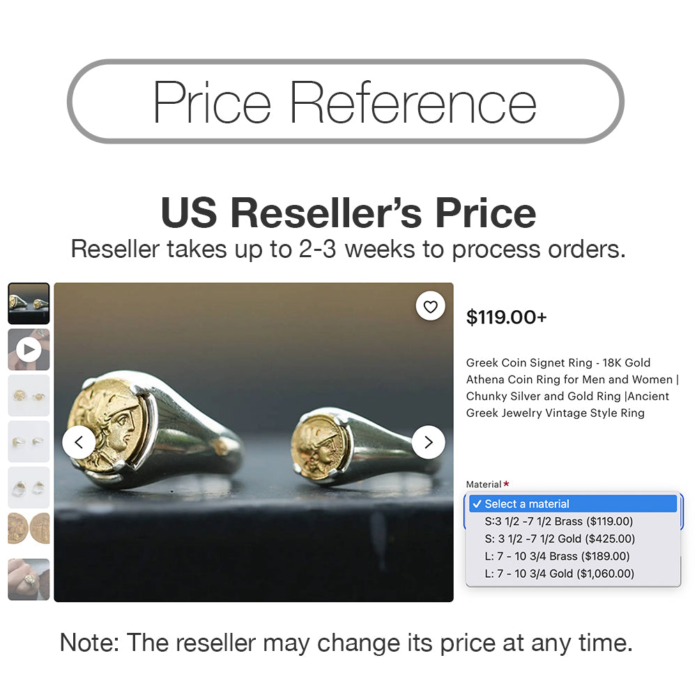 Get closer to ancient Greek history with our stunning Greek Coin Ring. This ring features a replica of a coin dating back to the time of Alexander the Great, approximately 2400 years ago in ancient Macedonia. One side of the coin showcases the head of Athena, the goddess of wisdom, while the reverse depicts Nike, the goddess of victory, holding a wreath and a stylish item in her hands. This detailed coin is securely set in a chunky, eye-catching signet-style ring, suitable for both him and her.
