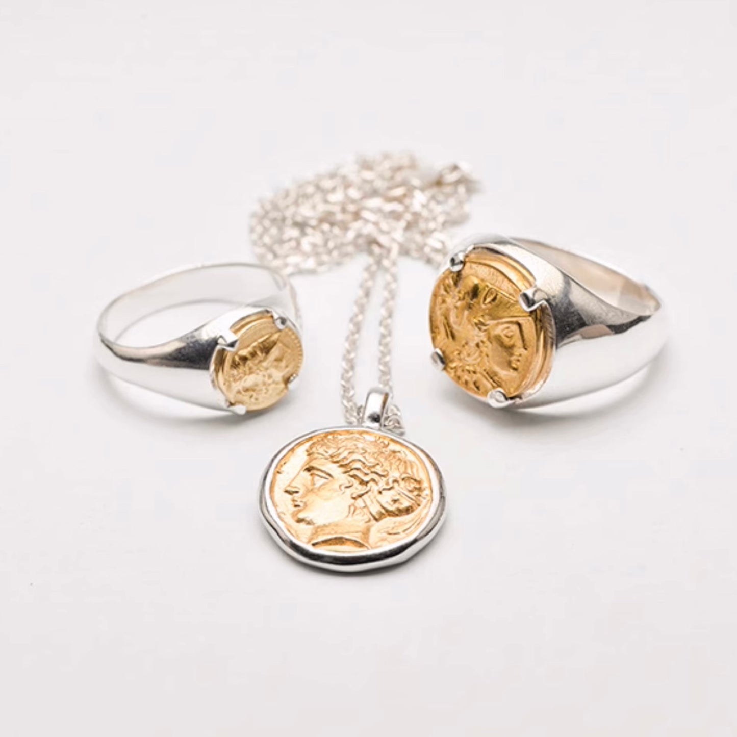 Get closer to ancient Greek history with our stunning Greek Coin Ring. This ring features a replica of a coin dating back to the time of Alexander the Great, approximately 2400 years ago in ancient Macedonia. One side of the coin showcases the head of Athena, the goddess of wisdom, while the reverse depicts Nike, the goddess of victory, holding a wreath and a stylish item in her hands. This detailed coin is securely set in a chunky, eye-catching signet-style ring, suitable for both him and her.