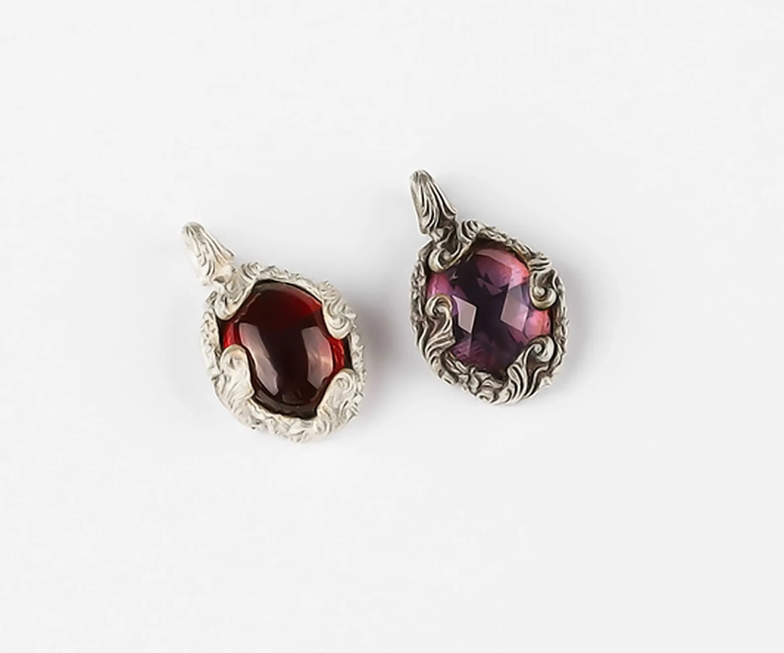 Gracefully blending timeless elegance with natural beauty, this handcrafted necklace is available in two captivating gemstone options — Amethyst and Garnet. Set in solid 925 sterling silver, each pendant features a delicately engraved floral motif in a romantic Baroque style, echoing the artistry of vintage European jewelry.
