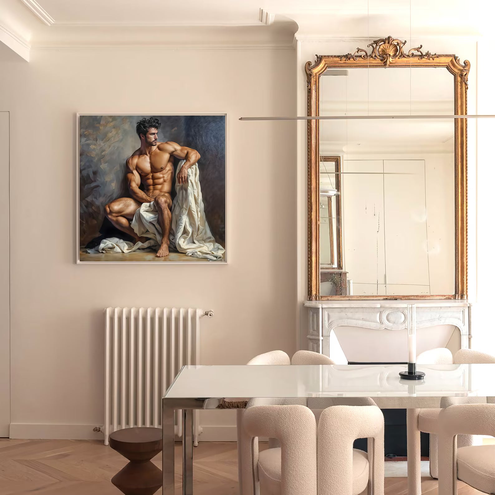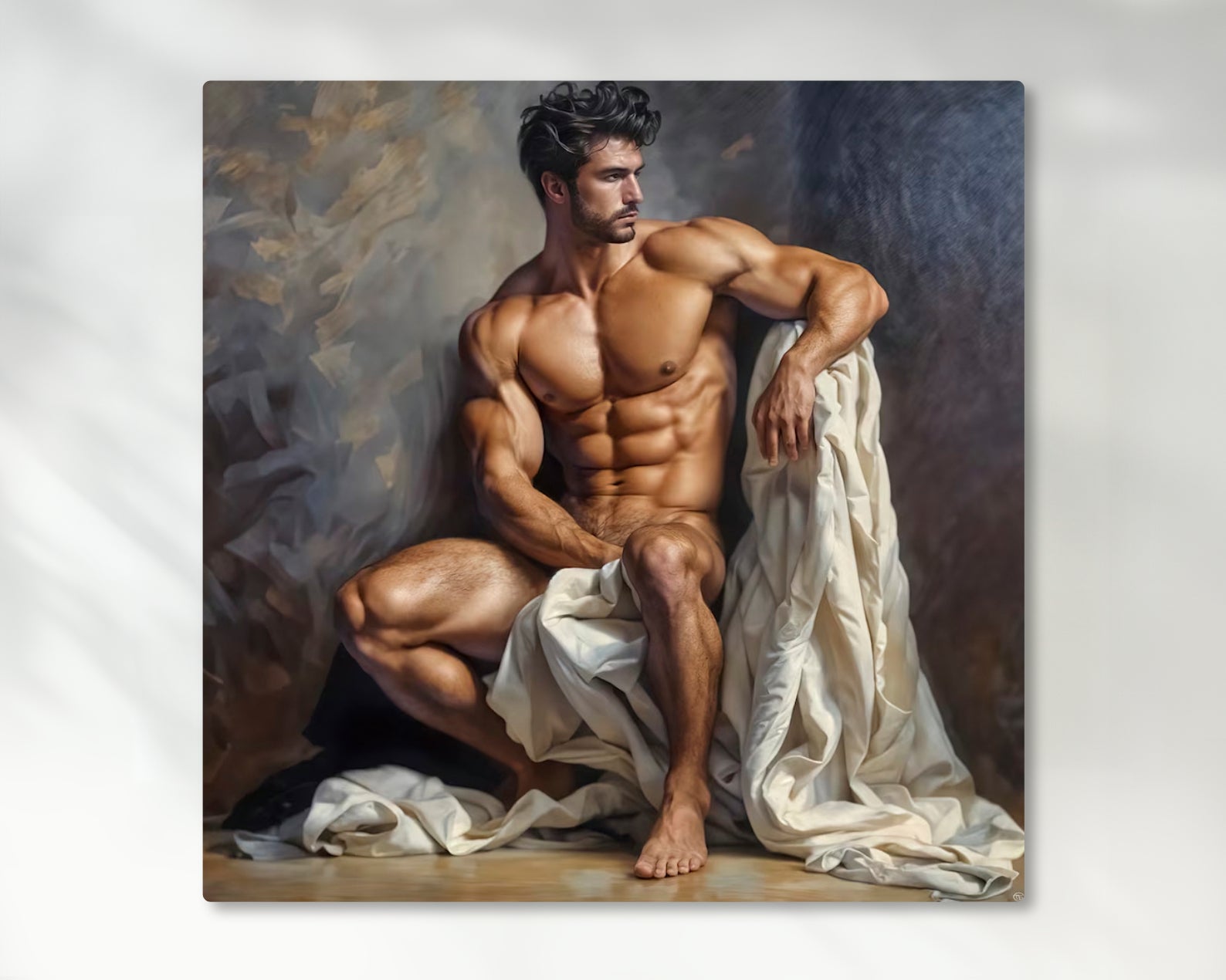 This stunning art print features a digital painting of a muscular male figure rendered in a classical yet modern style. The composition captures strength, sensuality, and elegance, making it a striking focal point for any space.