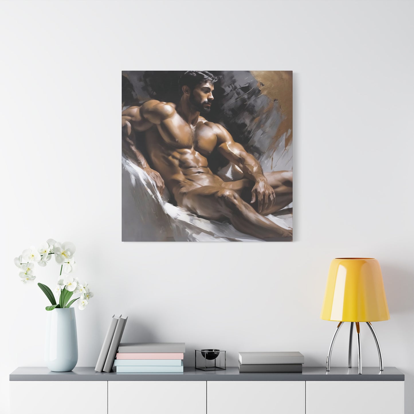 Elevate your decor with this captivating canvas print. Perfect for adding sophistication and allure to any room, this art piece features a handsome man lounging on a white sheet couch, creating a tranquil and inviting atmosphere.