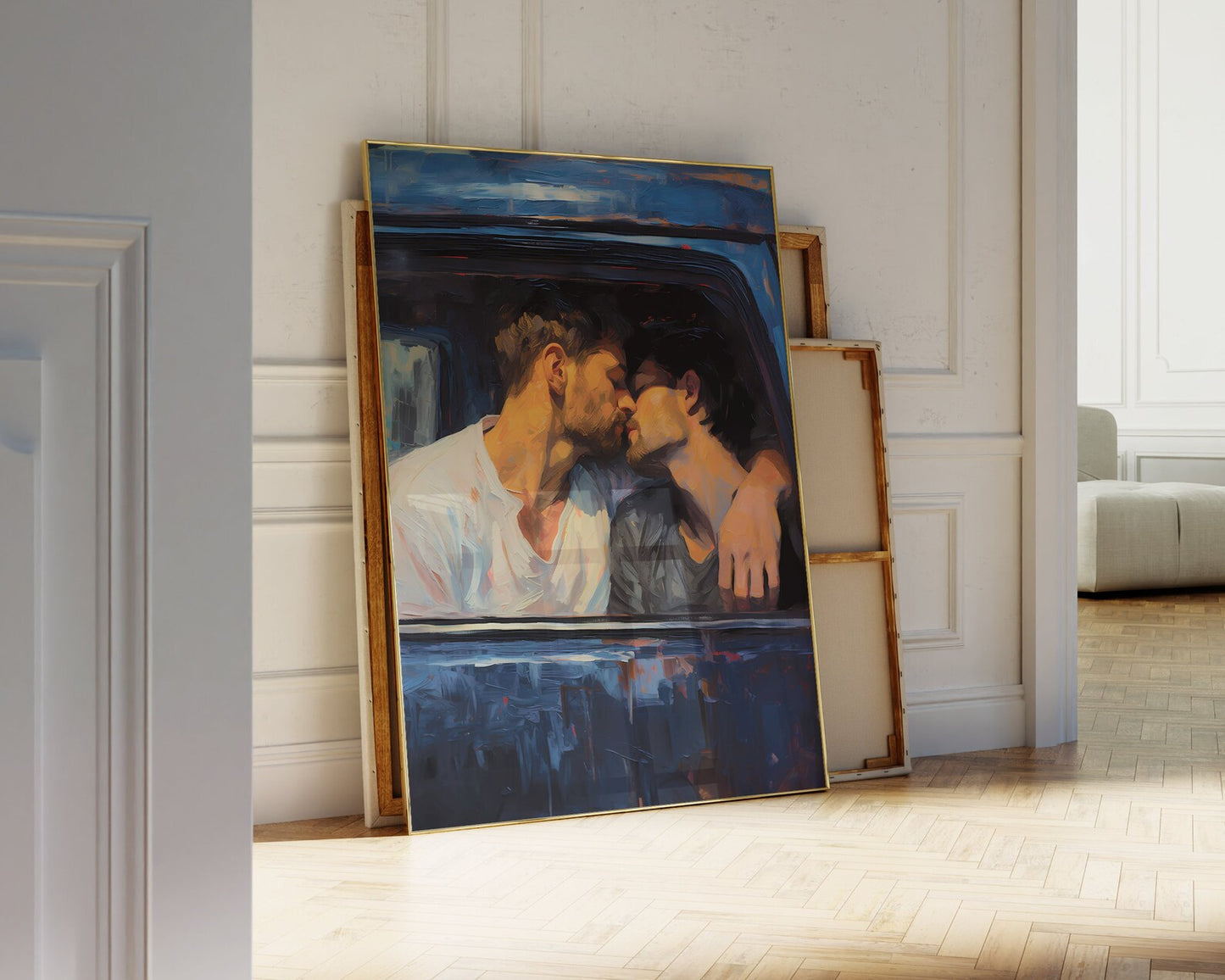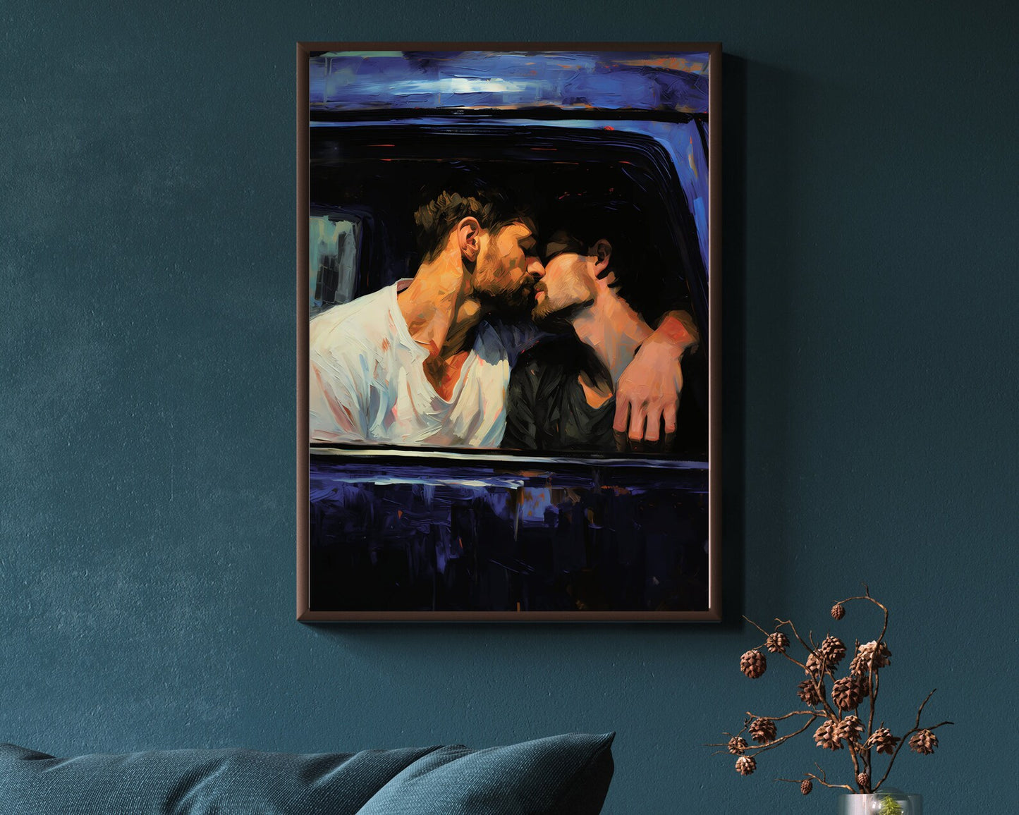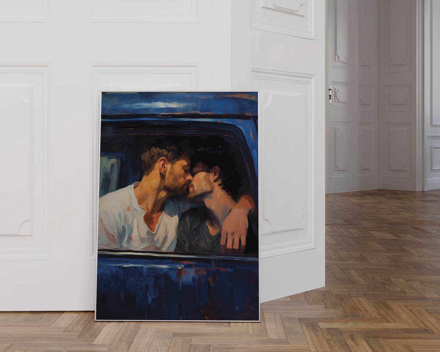 Introducing "Getaway Car," a captivating digital print that transports viewers to a moment of passion and liberation as two guys share a passionate kiss inside a car, poised to escape the confines of the world around them. Crafted with the evocative Palette Knife Technique style, this artwork captures the intensity and allure of their connection. As a perfect couple's gift, this Gay Print Poster elegantly celebrates love and adventure, making it a poignant addition to any home decor. Display this wall art with pride, allowing it to evoke a sense of freedom, unity, and the exhilarating beauty of escaping into each other's embrace, forever immortalized in this visually striking masterpiece.