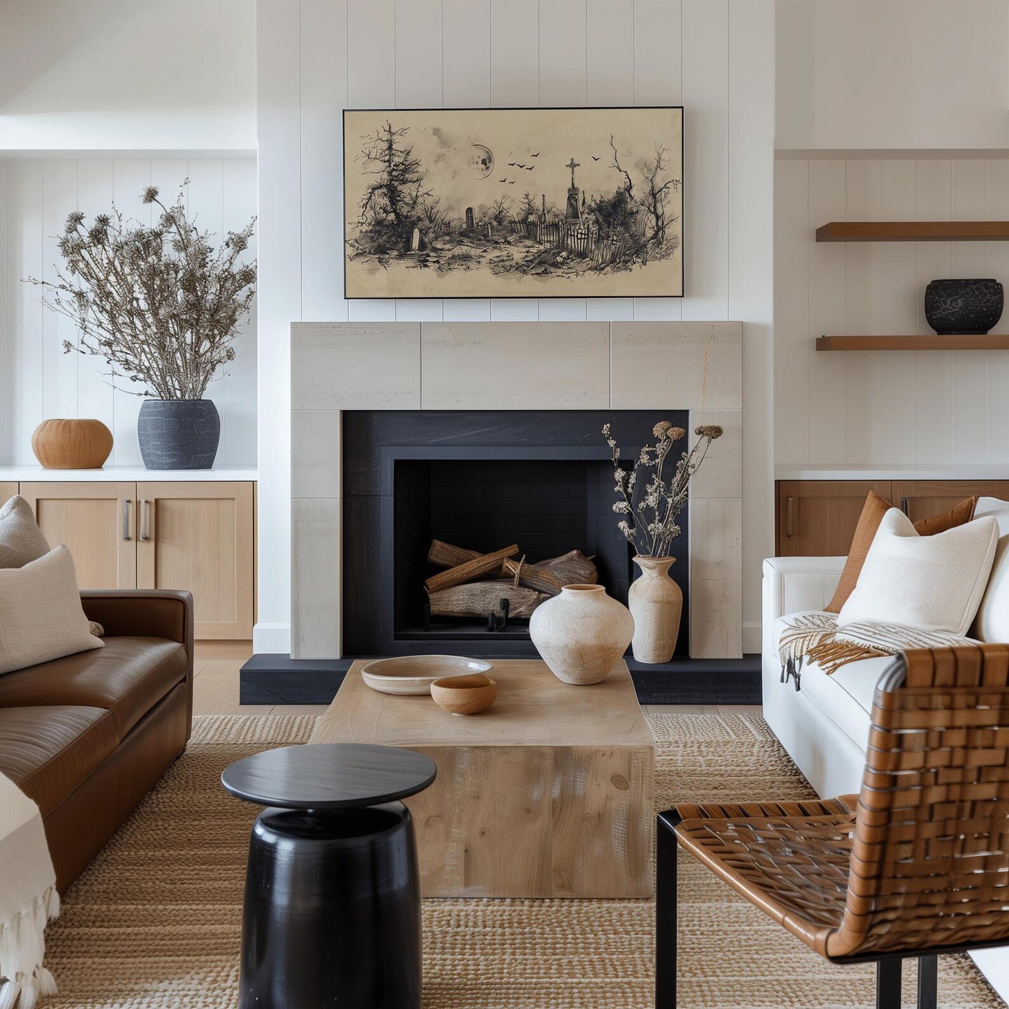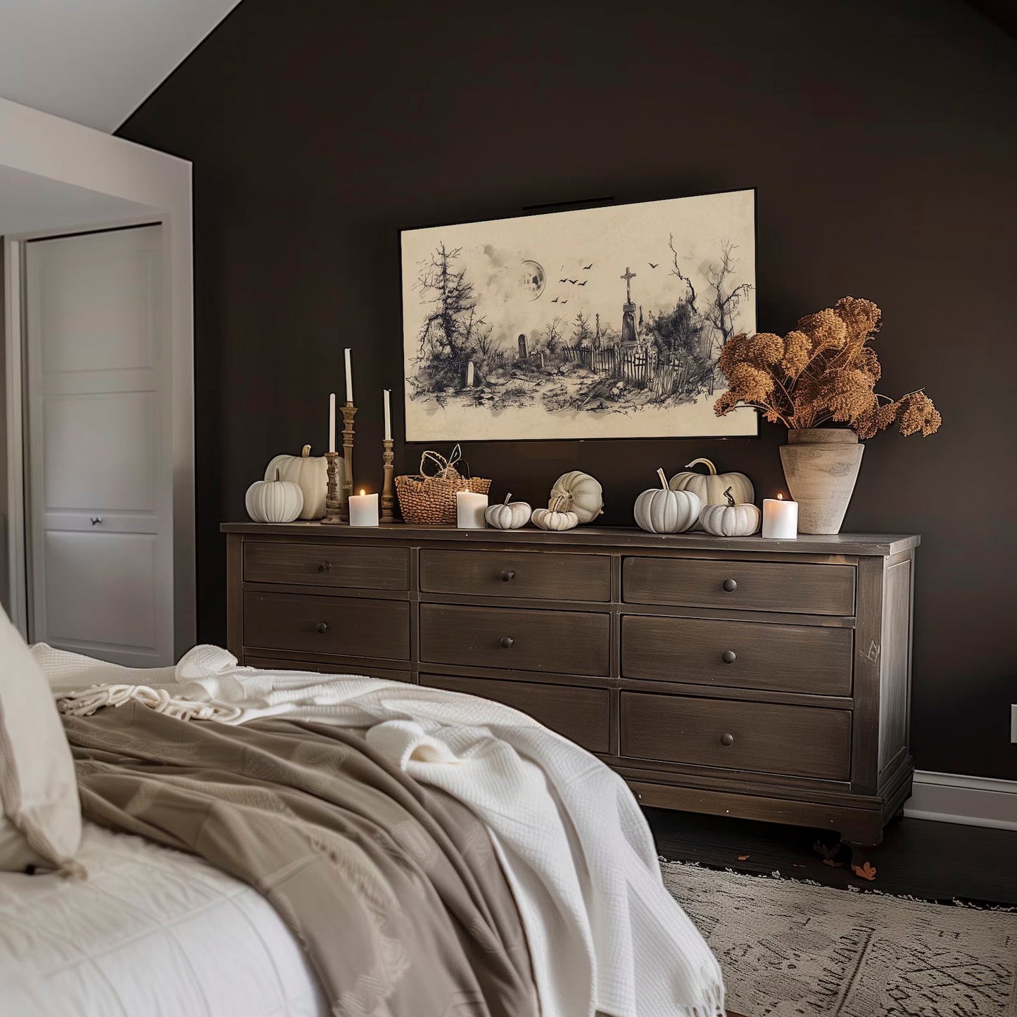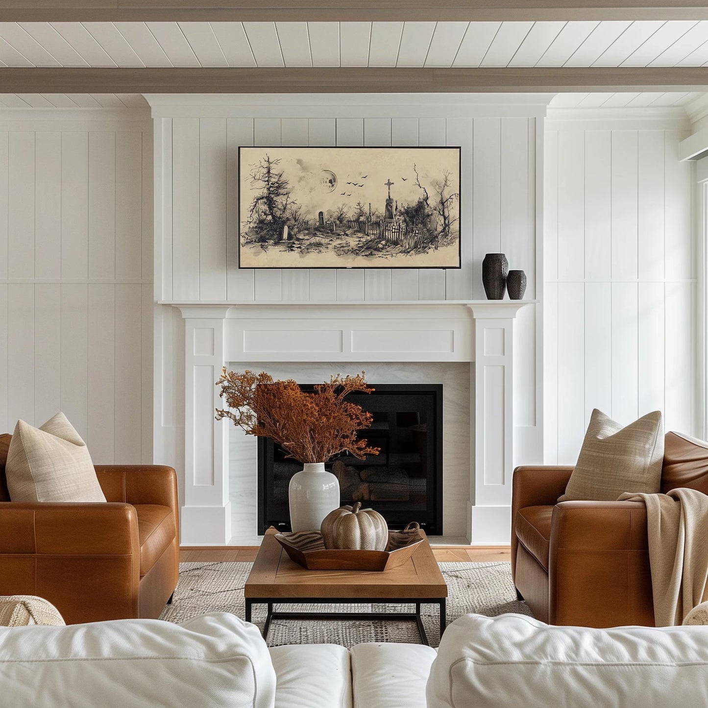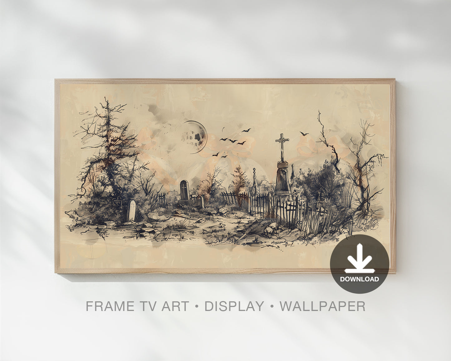 Graveyard Halloween Frame TV Art, Neutral Beige Halloween Decor, Spooky Landscape, available in 4K Ultra HD, it’s perfect for Samsung Frame TV and Smart TVs. It’s also compatible with a 16:9 ratio for commercial displays in stores, as well as personal use on wallpapers for computers, laptops, and iPads.