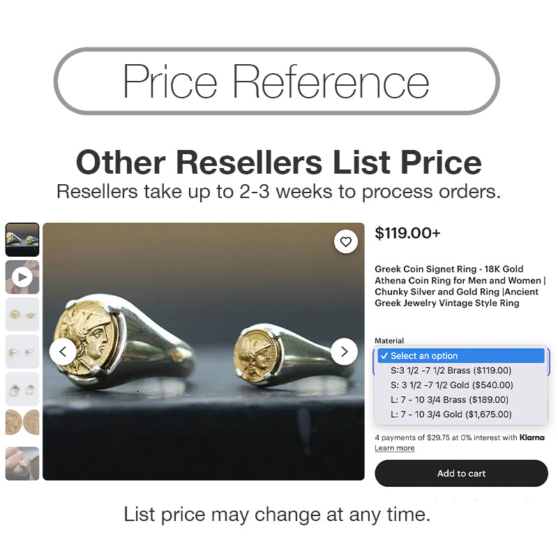 Get closer to ancient Greek history with our stunning Greek Coin Ring. This ring features a replica of a coin dating back to the time of Alexander the Great, approximately 2400 years ago in ancient Macedonia. One side of the coin showcases the head of Athena, the goddess of wisdom, while the reverse depicts Nike, the goddess of victory, holding a wreath and a stylish item in her hands. This detailed coin is securely set in a chunky, eye-catching signet-style ring, suitable for both him and her.