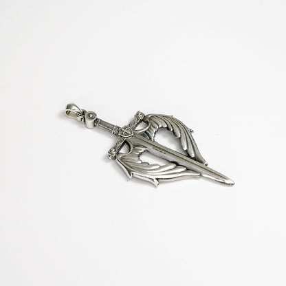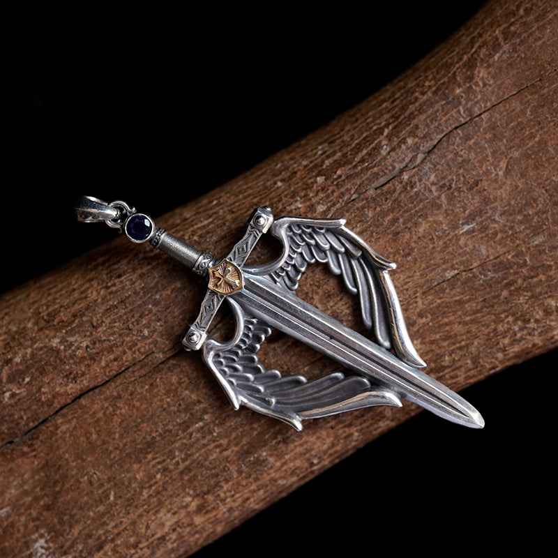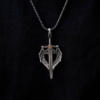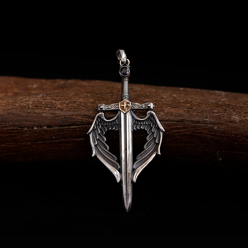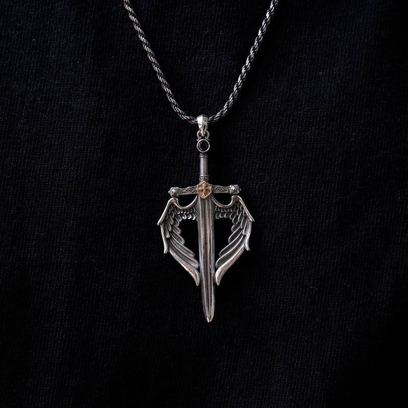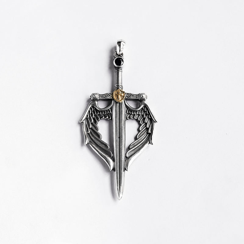 Guardian Angel Wings Sword Pendant Sterling Silver with 18K Gold Emblem