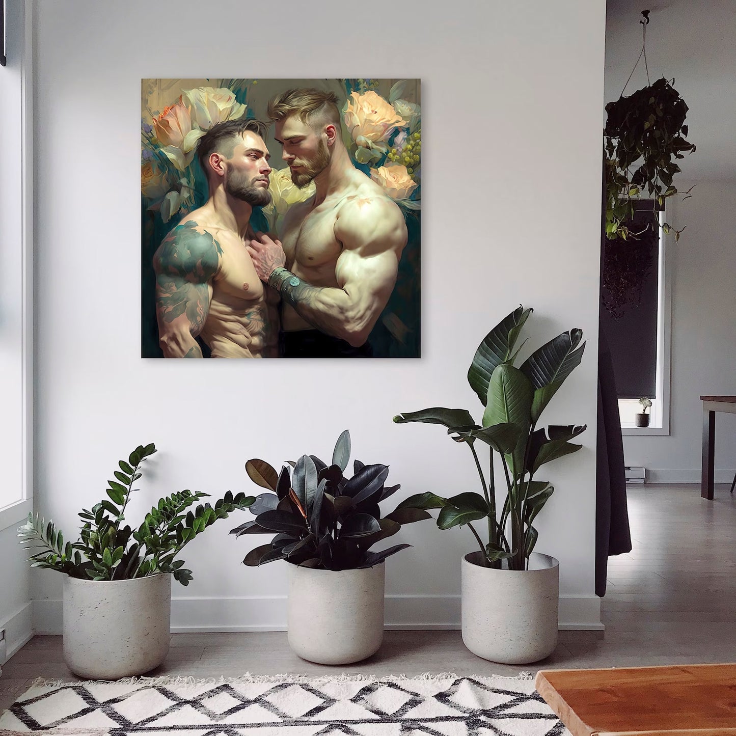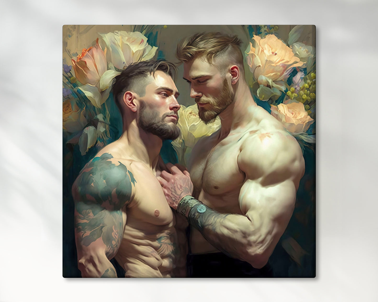 Realistic Male Couple Romantic Painting, Contemporary Gay Art, Postcard, Homoerotic Art Wall Poster. Modern universal square format - could be cropped in other ratio. Male portrait painting, gay gift, home decor, illustration.