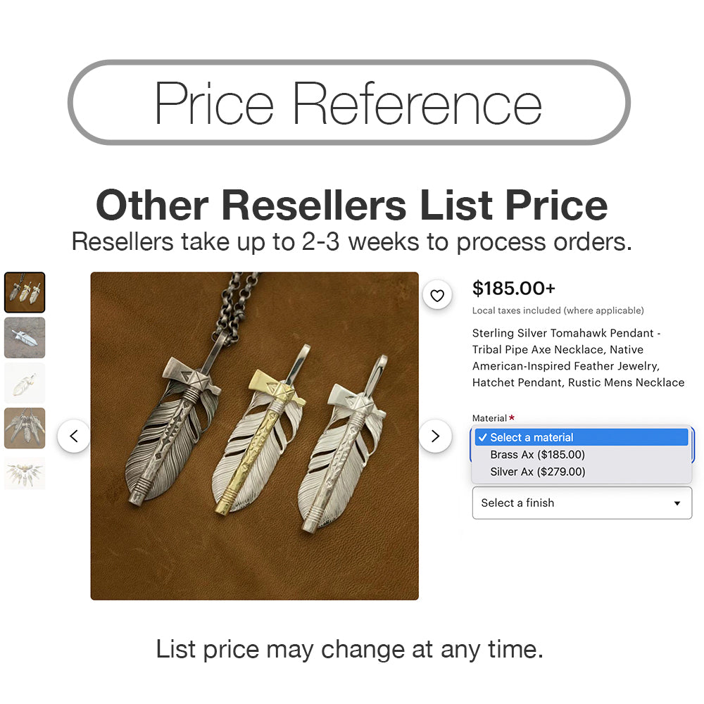 This unique pendant combines a beautifully detailed sterling silver feather with a miniature tomahawk axe peace pipe, inspired by Native American and Navajo designs. The tomahawk, available in silver, brass, or oxidized finish, adds a distinctive touch to this culturally rich piece. Perfect for those who appreciate heritage and meaningful, handcrafted jewelry.