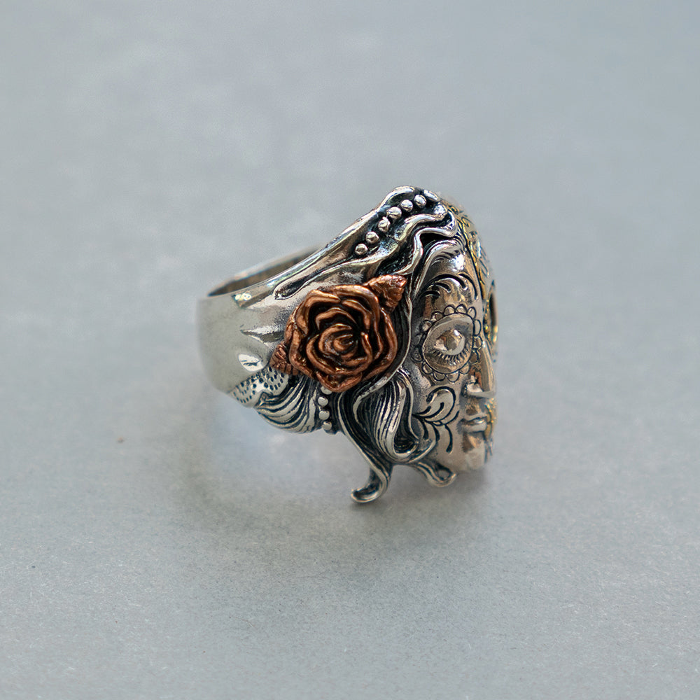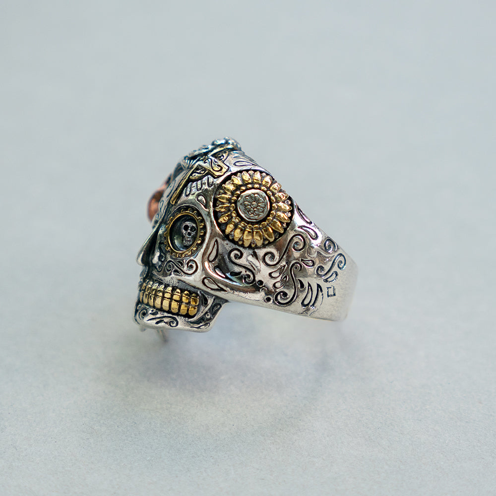 This ring pays homage to Mexican folklore and the vibrant tradition of Dia de los Muertos. The sugar skull design represents the celebration of life and the remembrance of loved ones. Handcrafted from sterling silver, this unique piece of jewelry captures the essence of the Day of the Dead with its intricate artistry. Whether you wear it as a statement piece or a symbol of cultural significance, this ring is a beautiful fusion of craftsmanship and tradition.