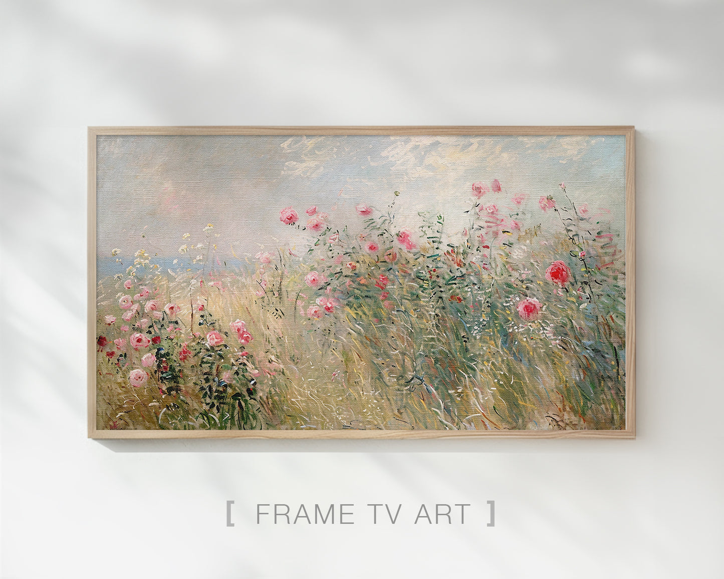 Seaside Wildflowers digital art with an antique white canvas texture. Available in 4K Ultra HD, it's perfect for Samsung Frame TV and Smart TV. Also compatible with a 16:9 ratio for displays, computers, laptops, and iPad wallpapers.