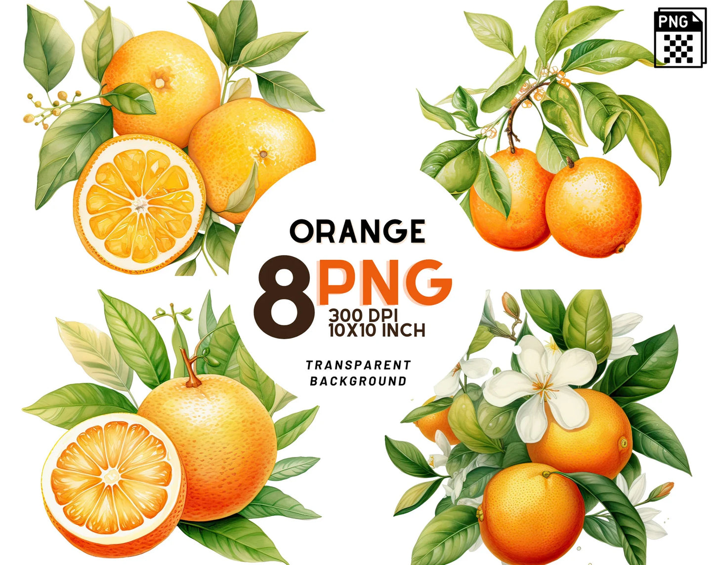 Oranges are beloved for their refreshing taste and their association with brightness and vitality. With this in mind, this clipart set is an ideal addition to your designs, perfect for creating projects that celebrate the beauty of nature and the invigorating qualities of oranges.