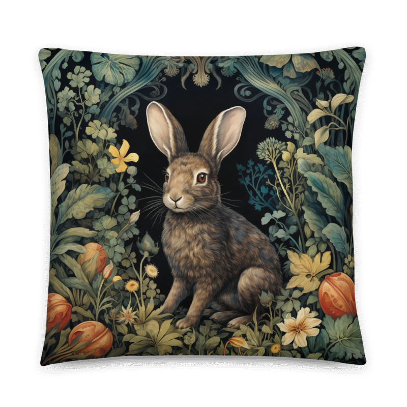 Into a magical woodland realm with our William Morris-inspired pillow. This enchanting piece features a delightful rabbit surrounded by a lush floral forest. Perfect for nature enthusiasts and art lovers, it brings a touch of whimsy to your home decor. Elevate your space with this unique blend of classic art and playful charm.