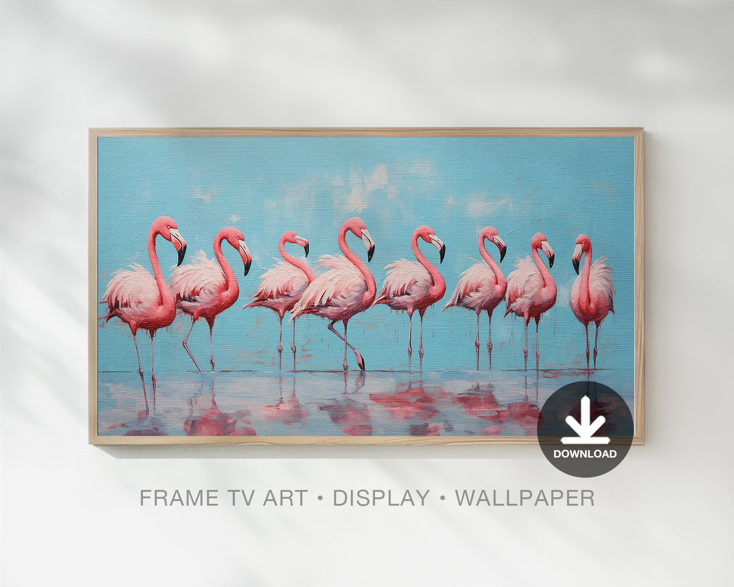 Flamingos digital art with an antique white canvas texture. Available in 4K Ultra HD, it's perfect for Samsung Frame TV and Smart TV. Also compatible with a 16:9 ratio for displays, computers, laptops, and iPad wallpapers.