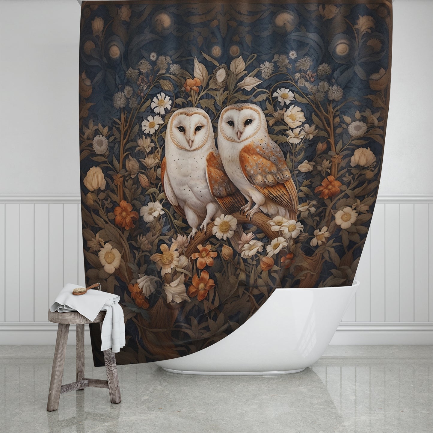 Woodland Barn Owl Couple Shower Curtain, William Morris Inspired, Farmhouse Bathroom, Floral Shower Curtain, 71" x 74"
