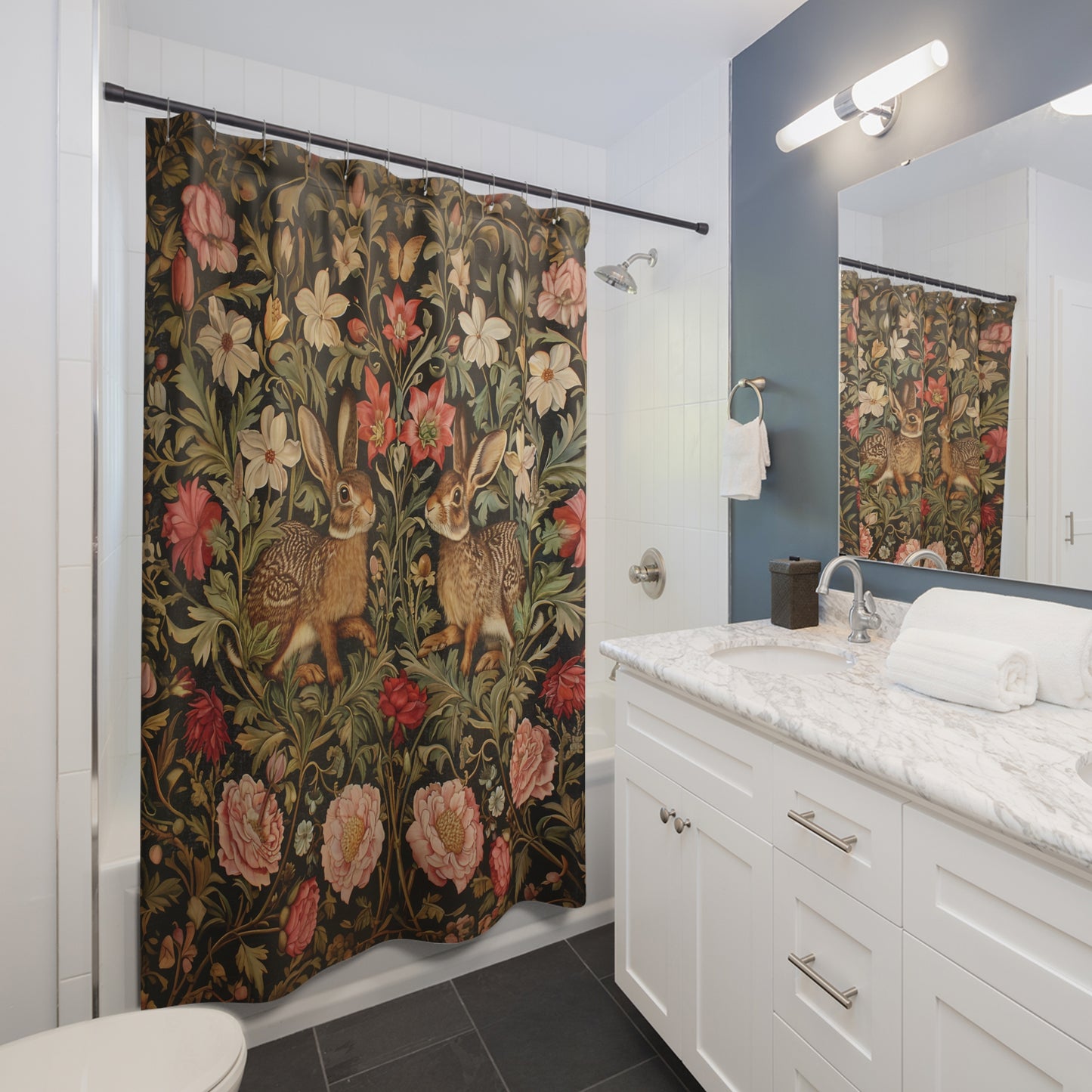 Adorable Bunnies Floral Garden Shower Curtain, William Morris Inspired, Farmhouse Bathroom, Floral Shower Curtain, 71" x 74"