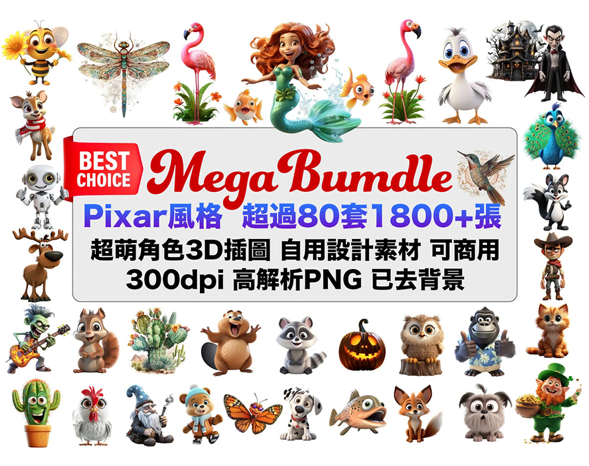 迪士尼 Pixar 風格, 超過80套1800+張 超萌3D插圖素材, 可自用/商用