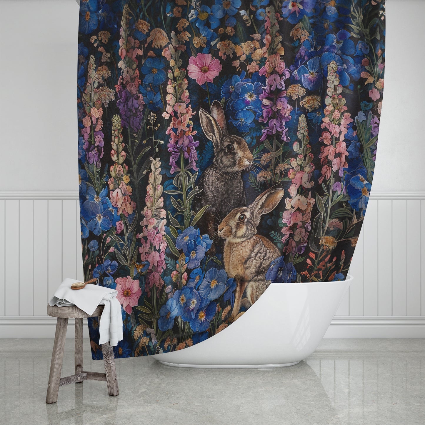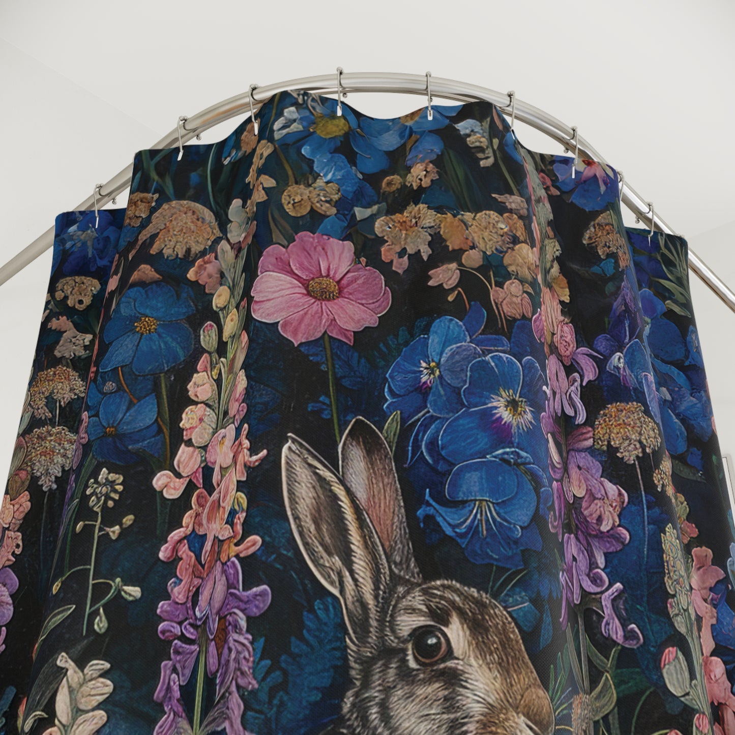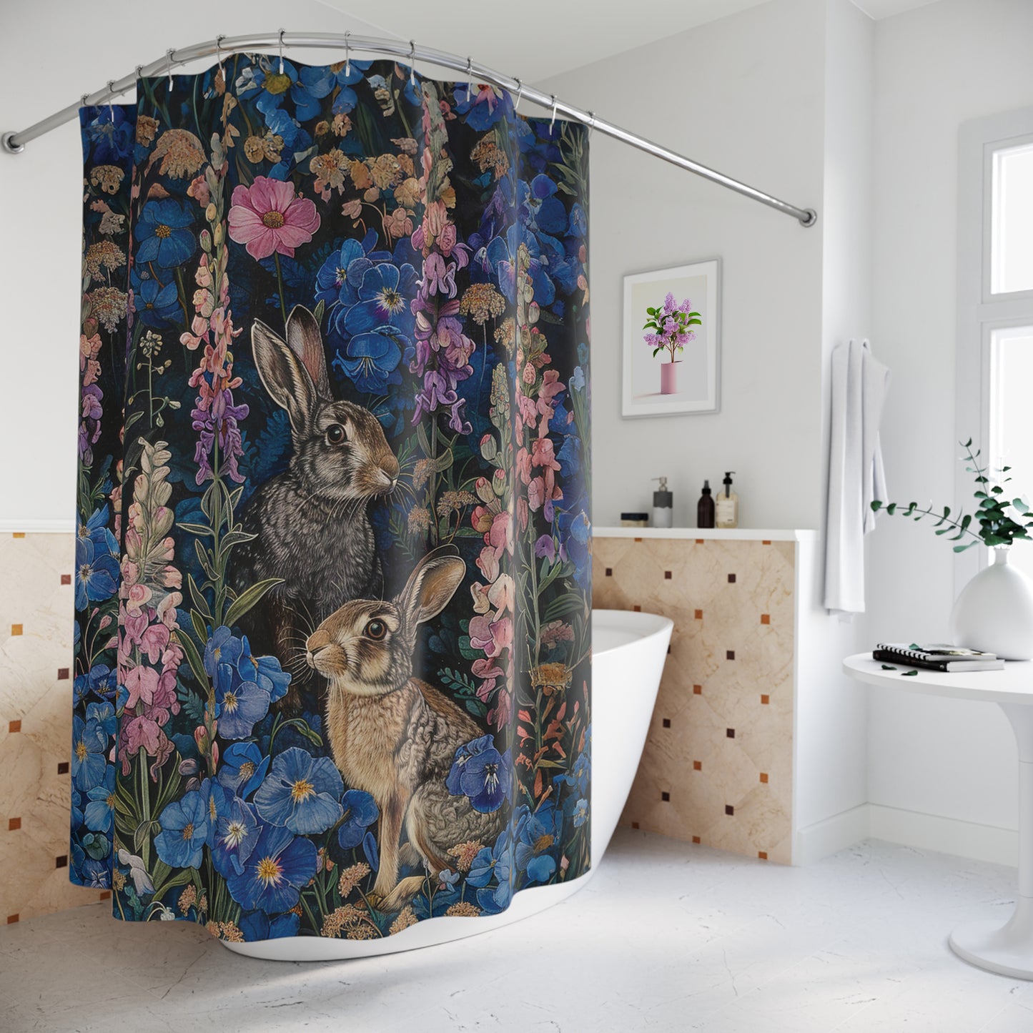 Step into a whimsical woodland wonderland with our enchanting Rabbit Floral Art Print Shower Curtain, a delightful fusion of nature-inspired beauty and timeless William Morris elegance. Crafted to bring a touch of charm to any bathroom, this curtain features adorable bunnies amidst a lush floral tapestry, reminiscent of Morris' iconic designs. Perfect for nature lovers and those with a penchant for rustic elegance, it makes an ideal gift for bunny enthusiasts or a charming addition to any woodland-themed home decor. Transform your daily routine into a magical escape with this delightful shower curtain.